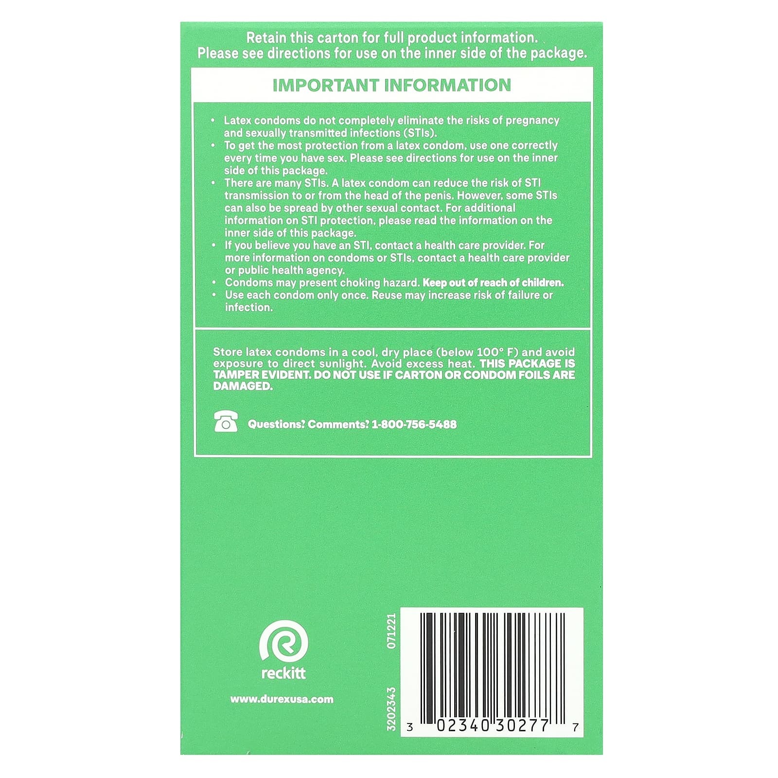 Храните латексные презервативы в сухом и прохладном месте (при температуре ниже 100 ºF) во избежание воздействия прямых солнечных лучей. Избегать чрезмерного нагревания.