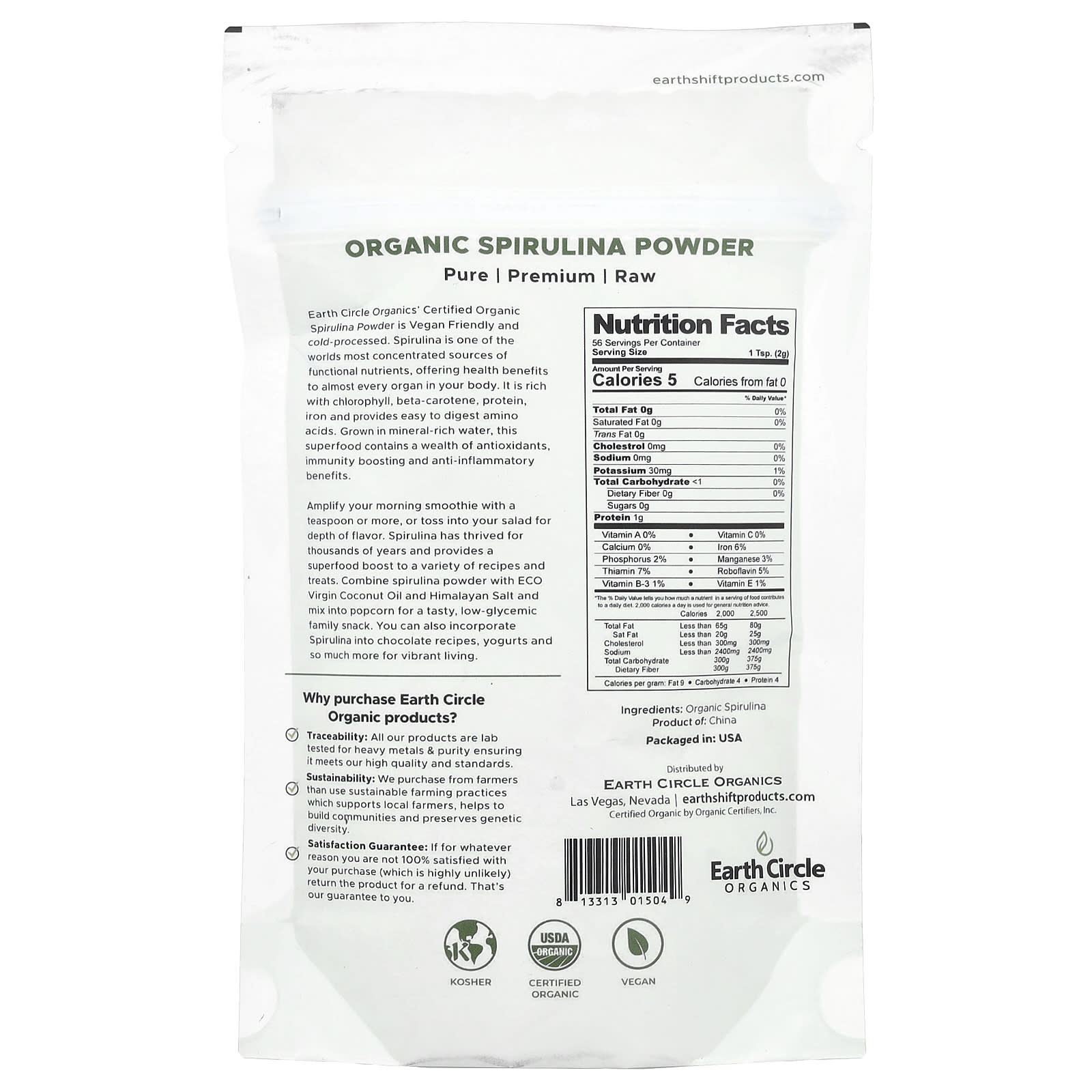 Сертифицированный органический порошок спирулины от Earth Circle Organics подходит для веганов и изготавливается методом холодной обработки. Спирулина — один из самых концентрированных источников эффективных питательных веществ, который приносит пользу почти каждому органу вашего организма. Она богата хлорофиллом, бета-каротином, белком, железом и содержит легко усваиваемые аминокислоты. Этот суперфуд, выращенный в насыщенной минералами воде, содержит множество антиоксидантов, повышающих иммунитет и обладающих противовоспалительными свойствами.