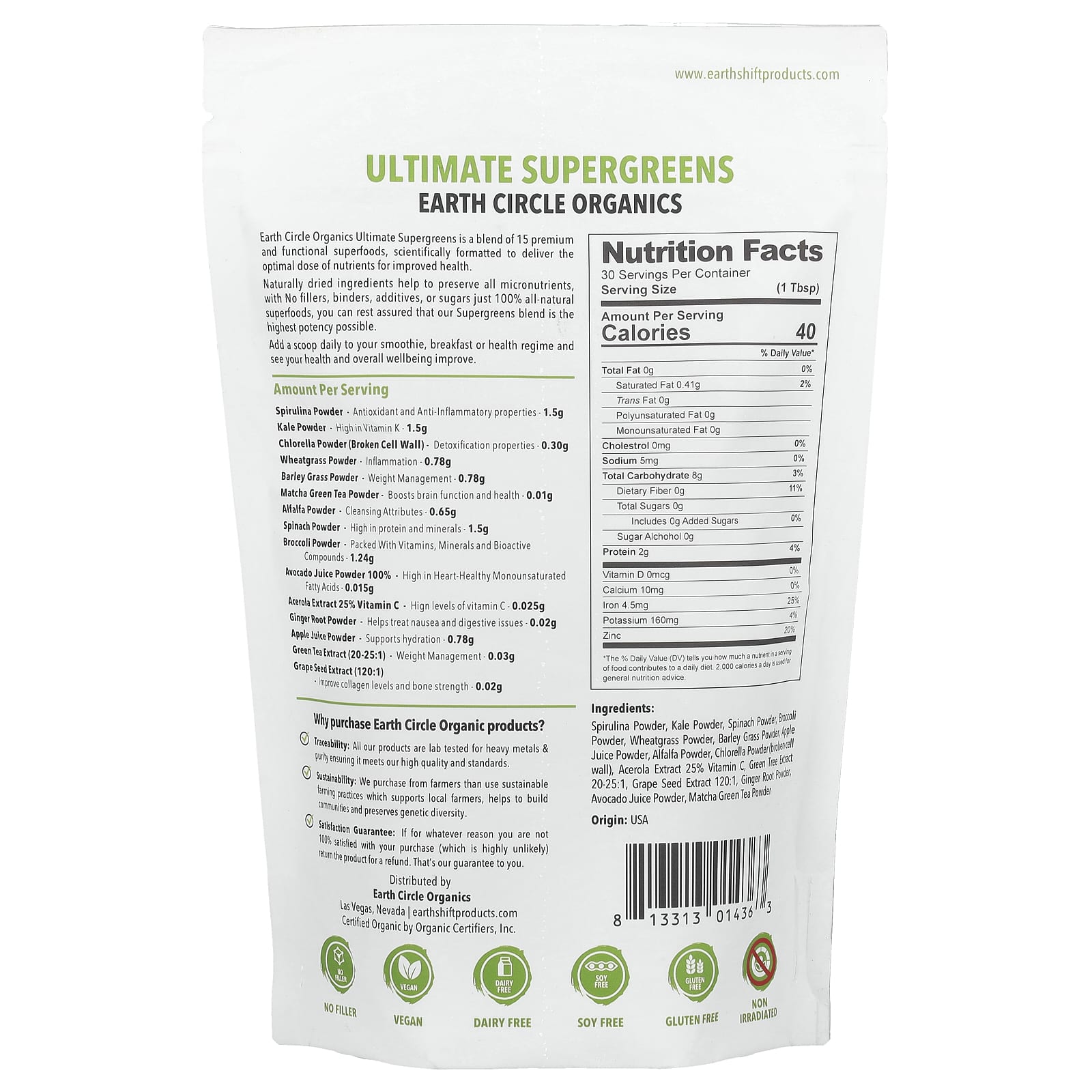 Earth Circle Organic Ultimate Supergreens - это смесь 15 функциональных суперфудов премиального качества, разработанных с учетом научных данных и обеспечивающих оптимальную дозу питательных веществ для улучшения здоровья.