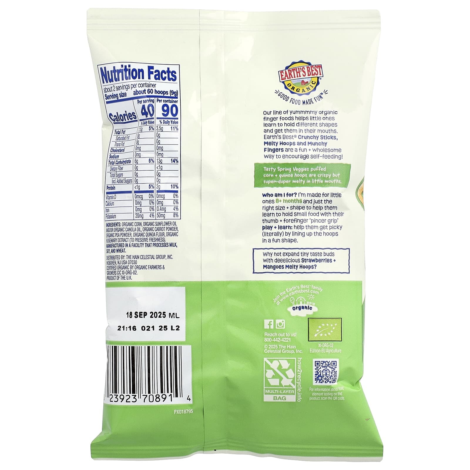 Органическая кукуруза, органическое подсолнечное масло и/или органическое масло канолы, органический порошок из моркови, порошок из органического гороха, органическая мука из киноа, экстракт органического розмарина (для сохранения свежести).