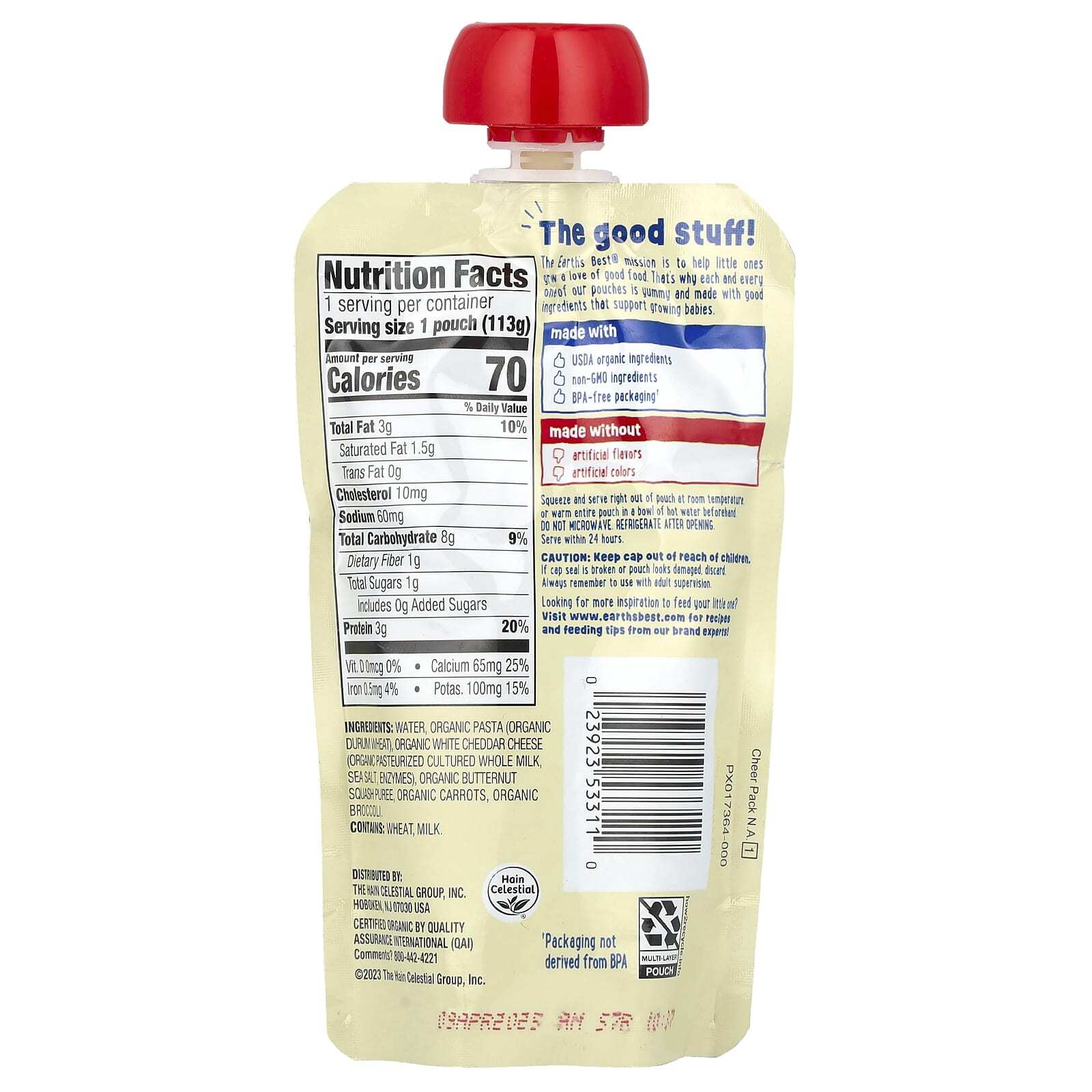 Water, organic pasta (organic durum wheat), organic white cheddar cheese (organic pasteurized cultured whole milk, sea salt, enzymes), organic butternut squash puree, organic carrots, organic broccoli.