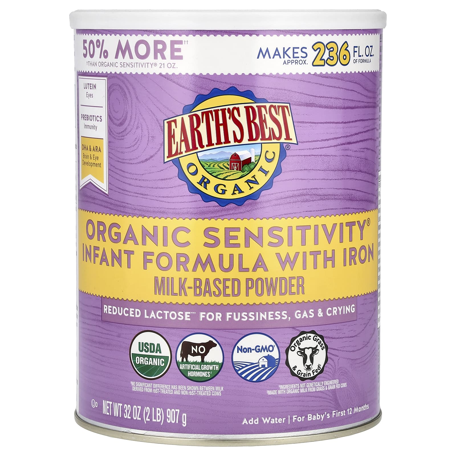 Смесь для младенцев с железом EARTH'S BEST ORGANIC® Sensitivity имеет пониженное содержание лактозы, на 95% меньше лактозы по сравнению с нашей стандартной молочной смесью, что помогает уменьшить нервозность и газообразование. Эта легко усваиваемая † органическая смесь для младенцев с железом отвечает всем требованиям FDA к детскому питанию и не содержит запрещенных синтетических пестицидов и удобрений.