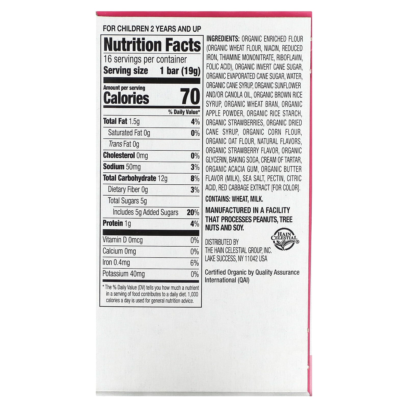 Органическая обогащенная мука (органическая пшеничная мука, ниацин, восстановленное железо, тиамина мононитрат, рибофлавин, фолиевая кислота), органический инвертный тростниковый сахар, органический выпаренный тростниковый сахар, вода, органический тростниковый сироп, органическое подсолнечное масло и/или рапсовое масло, сироп из органического коричневого риса, органические пшеничные отруби, порошок из органического яблока, органический рисовый крахмал, органическая клубника, органический выпаренный тростниковый сироп, органическая кукурузная мука, органическая овсяная мука, натуральные ароматизаторы. органический клубничный ароматизатор, органический глицерин, пищевая сода, винный камень, органическая аравийская камедь, органический ароматизатор «Масло» (молоко), морская соль, пектин, лимонная кислота, экстракт красной капусты [в качестве красителя].