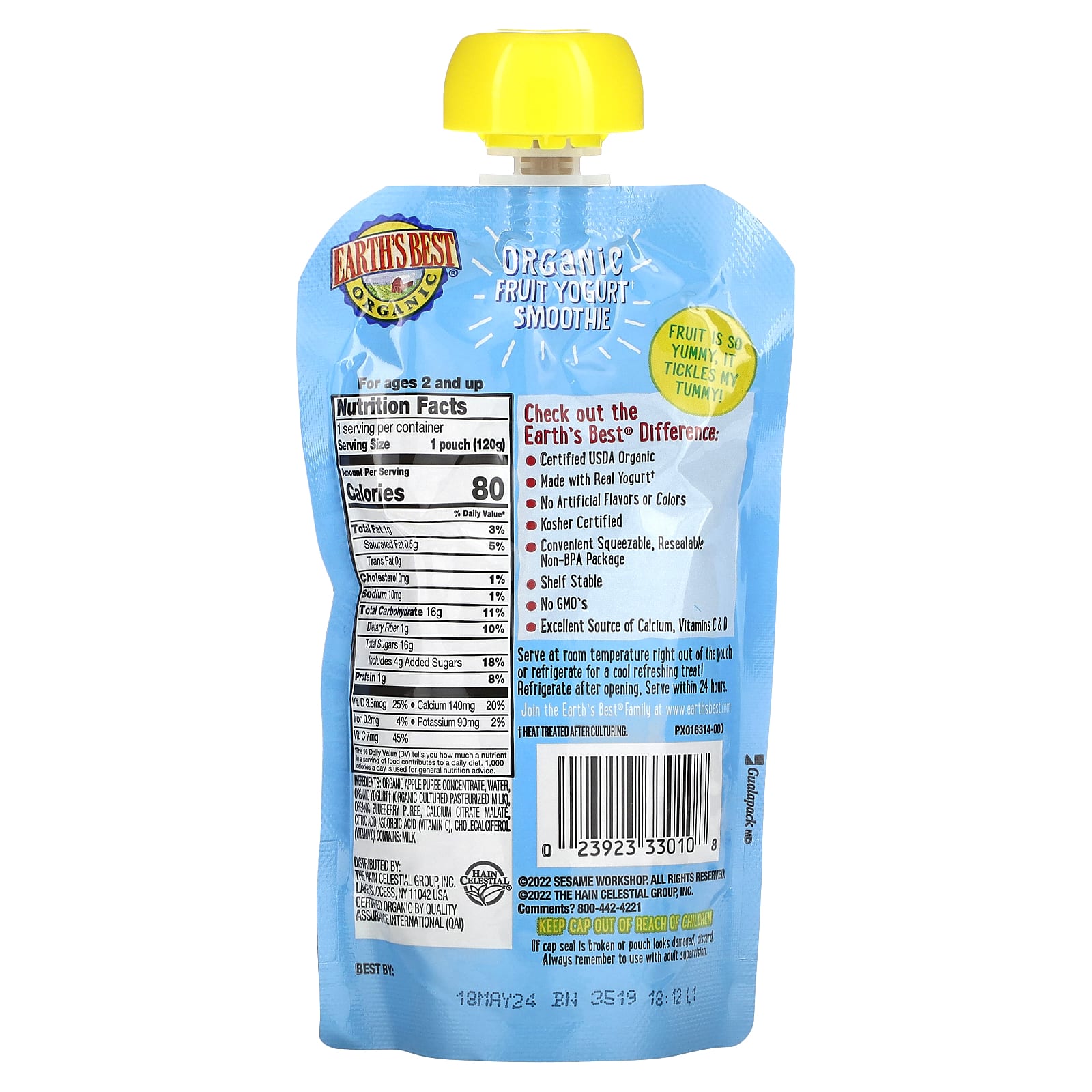 Концентрат органического яблочного пюре, вода, органический йогурт† (органическое кисло-пастеризованное молоко), органическое пюре из голубики, цитрат малат кальция, лимонная кислота, аскорбиновая кислота (витамин C), холекальциферола витамина D).
