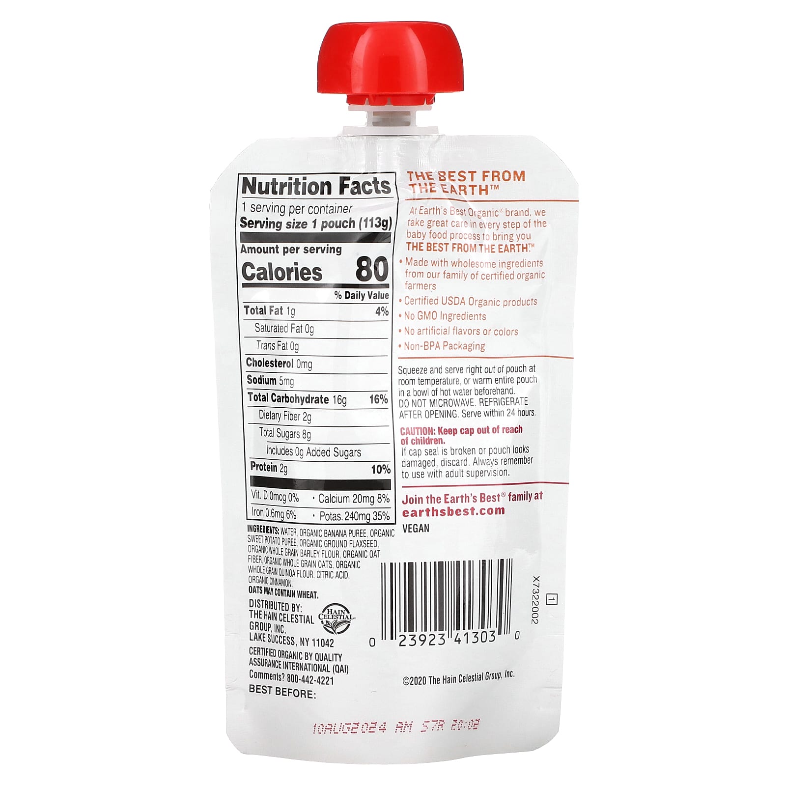 Вода, органическое банановое пюре. пюре из органического батата, органические молотые льняные семечки, органическая цельнозерновая ячменная мука. органическая овсяная клетчатка, органический цельнозерновой овес. органическая цельнозерновая мука киноа, лимонная кислота, органическая корица.