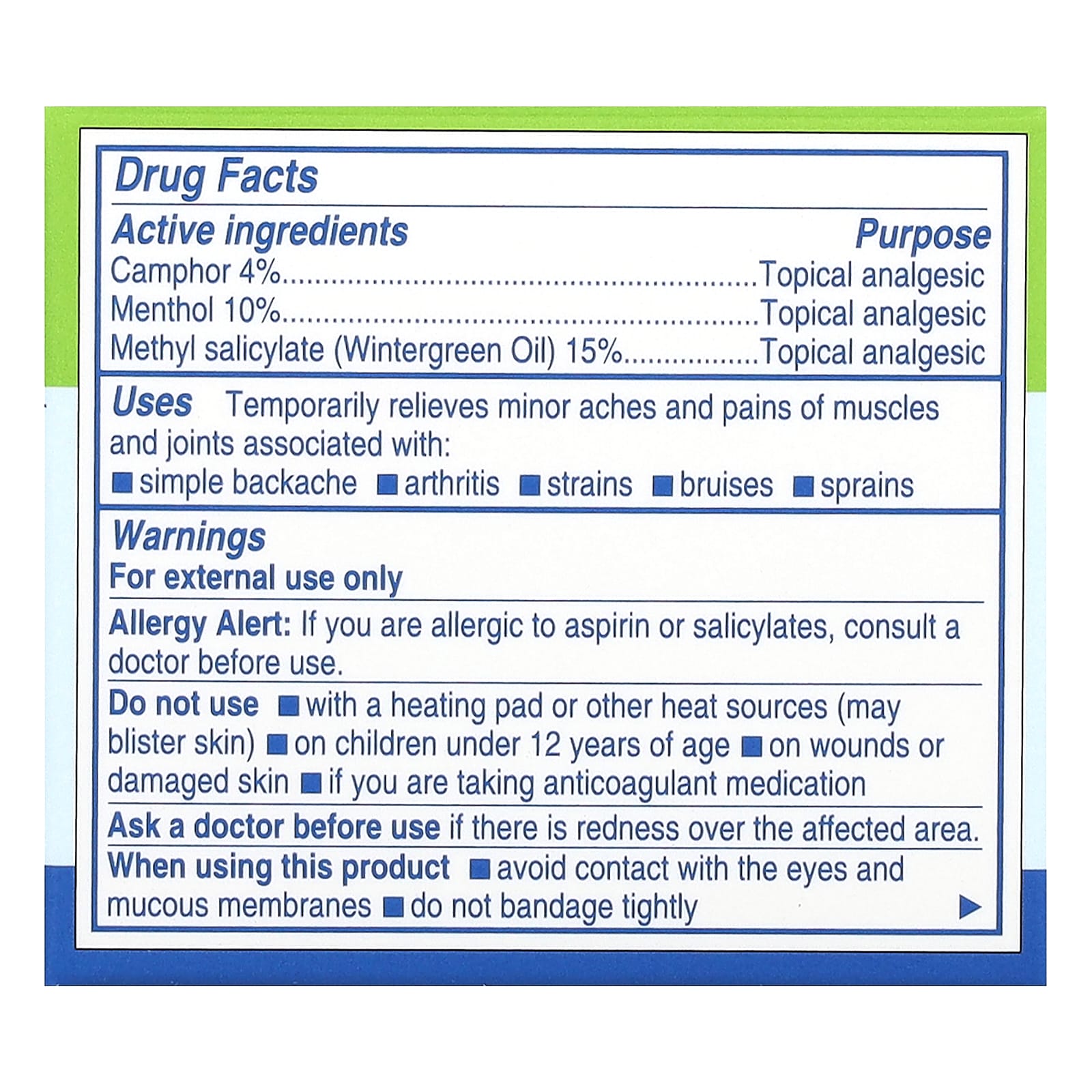 | Метилсалицилат (масло грушанки) 15% | Анальгетик местного применения |