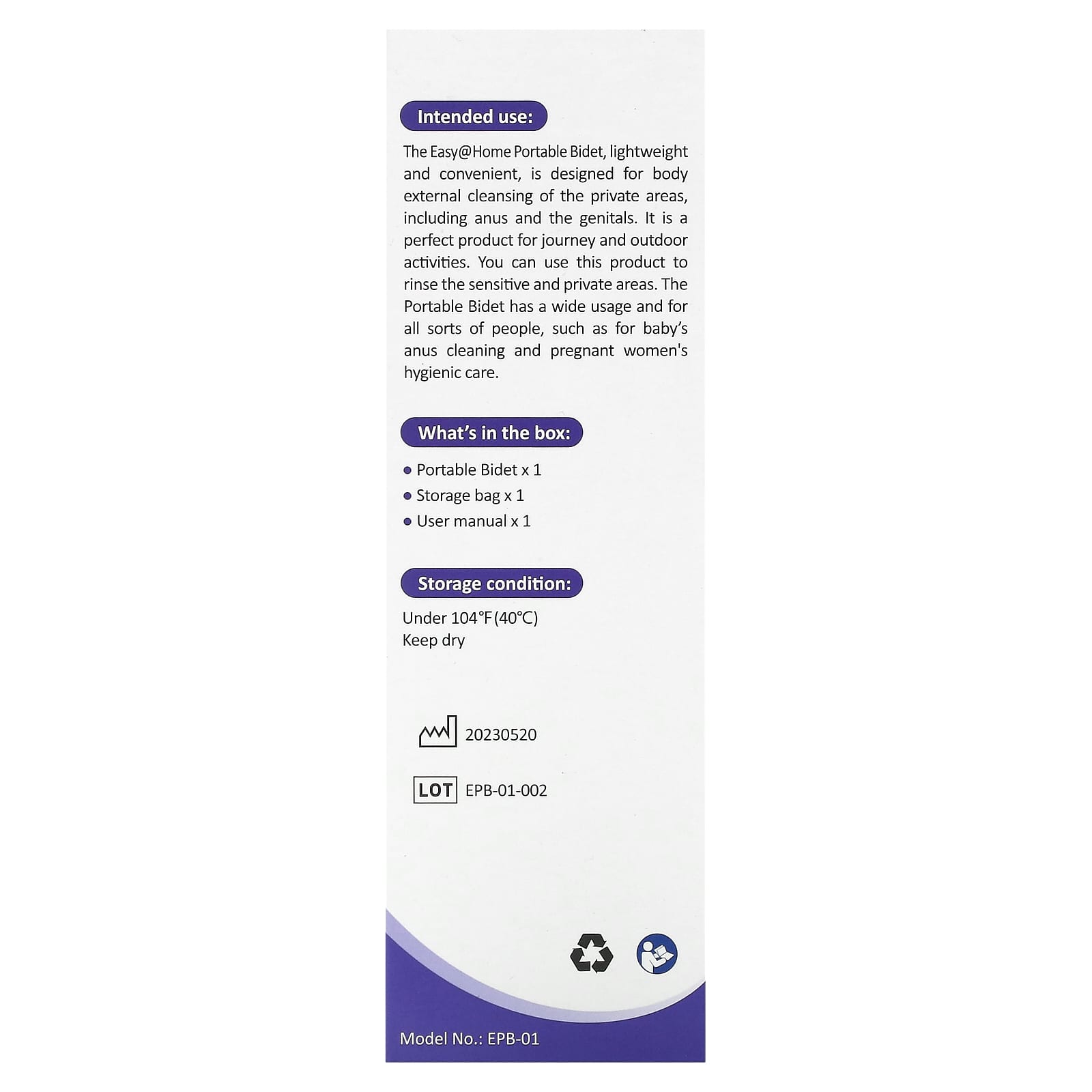Легкое и удобное портативное биде Easy @ Home предназначено для наружного очищения отдельных участков тела, включая анус и гениталии. Это идеальный продукт для путешествий и активного отдыха. Вы можете использовать этот продукт для ополаскивания чувствительных и интимных зон. Переносное биде имеет широкое применение и подходит для самых разных людей, например, для чистки ануса младенцам и для гигиены беременных.