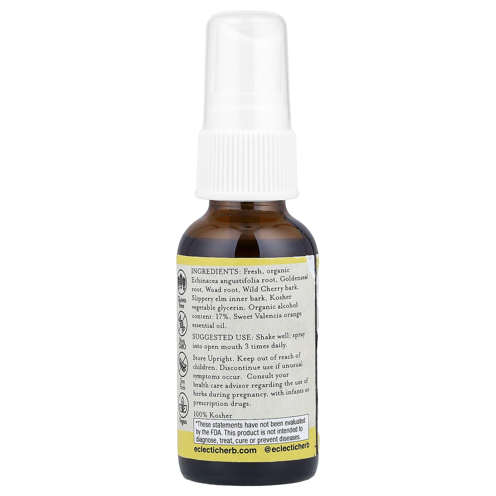 Свежий продукт, органическая трава эхинацеи узколистной (Echinacea angustifolia), экстракт корня желтокорня (Hydrastis canadensis L.), корень вайды (Isatidis spp.), кора черешни (Prunus serotina), внутренняя часть коры красного вяза (Ulmus fulva), кошерный растительный глицерин, содержание органического спирта: 17%. эфирное масло сладкого валенсийского апельсина.