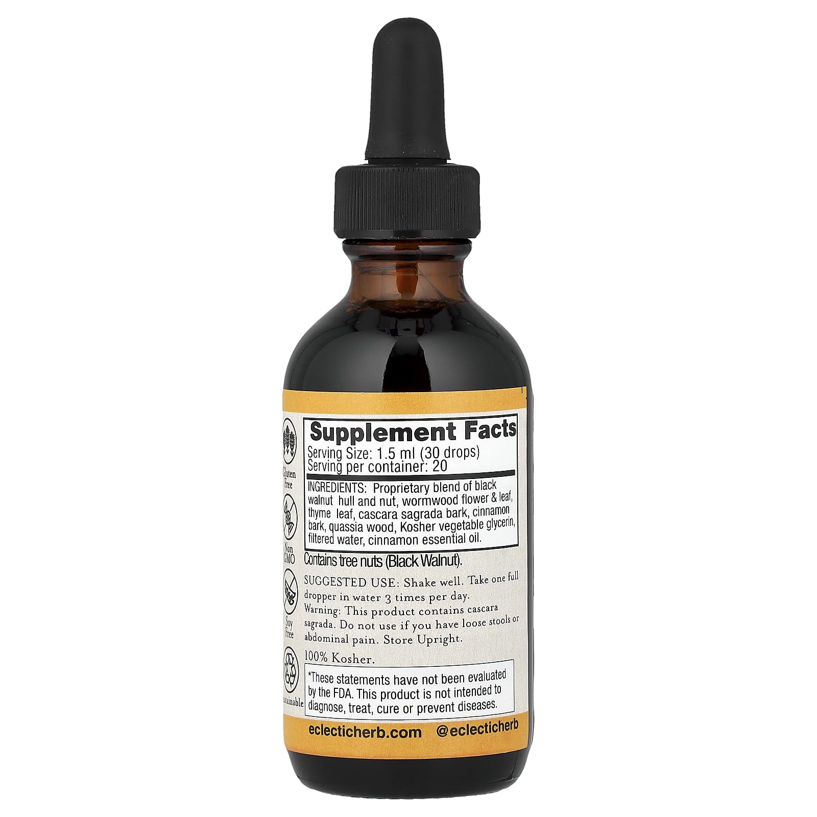 | Ингредиенты: Запатентованная смесь скорлупы и орехов черного грецкого ореха, листьев и цветков полыни горькой, листьев чабреца, коры каскары, коры корицы, дерева квасии, кошерного растительного глицерина, фильтрованной воды, эфирного масла корицы. |
