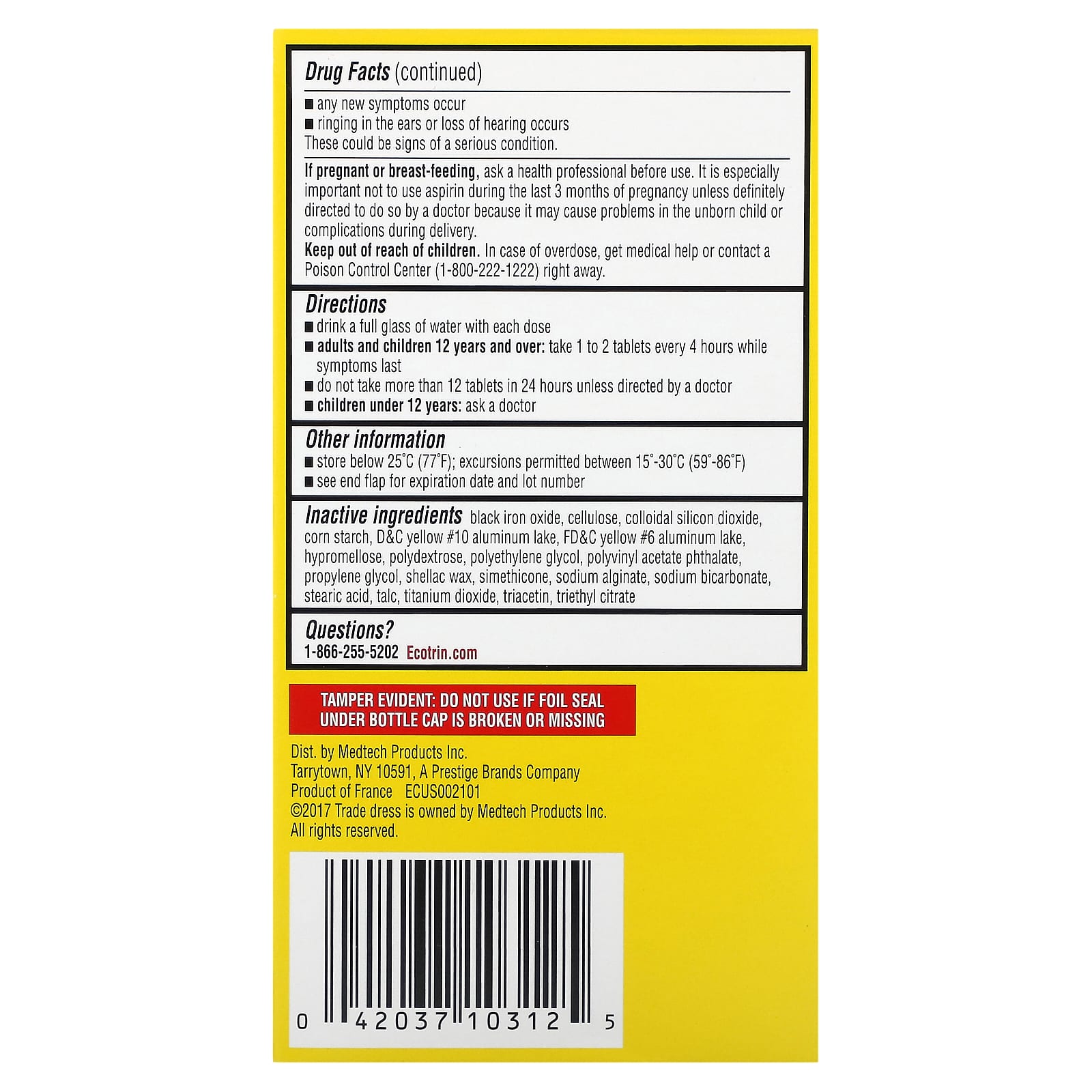 | Черный оксид железа, целлюлоза, коллоидный диоксид кремния, кукурузный крахмал, D&C желтый 10 алюминиевый лак, FD&C желтый 6 алюминиевый лак, гипромеллоза, полидекстроза, полиэтиленгликоль, поливинилацетат фталат, пропиленгликоль, шеллак, симетикон, альгинат натрия, натрий бикарбонат, стеариновая кислота, тальк, диоксид титана, триацетин, триэтилцитрат. | |