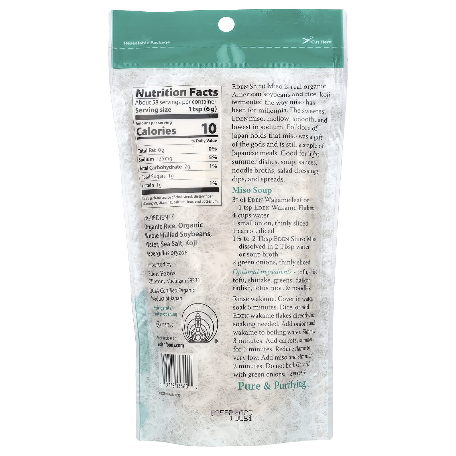 ЭДЕН Широ Мисо - это настоящие органические американские соевые бобы и рис, кодзи которых подвергается ферментации, как это было на протяжении тысячелетий. Самое сладкое мисо EDEN, мягкое, с минимальным содержанием натрия. Фольклор Японии считает, что мисо было подарком богов и до сих пор является основным продуктом японской кухни.
