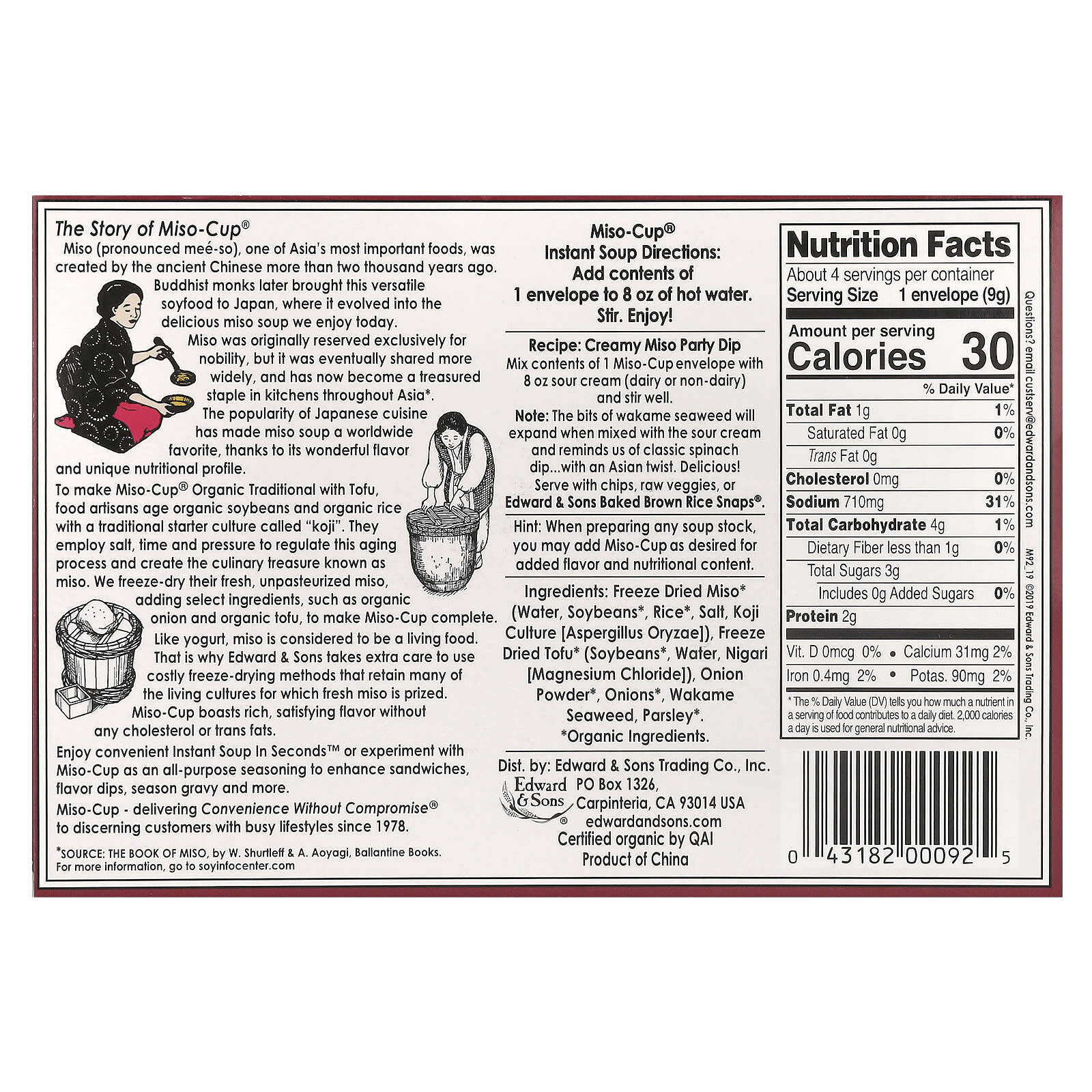 Как и йогурт, мисо считается «живой» пищей. Вот почему Edward & Sons с особенной тщательностью использует дорогостоящие методы сублимации, с помощью которых сохраняются многие живые культуры, благодаря которым ценится свежий продукт мисо. Miso-Cup имеет насыщенный, насыщенный вкус, не содержит холестерина и трансжиров.