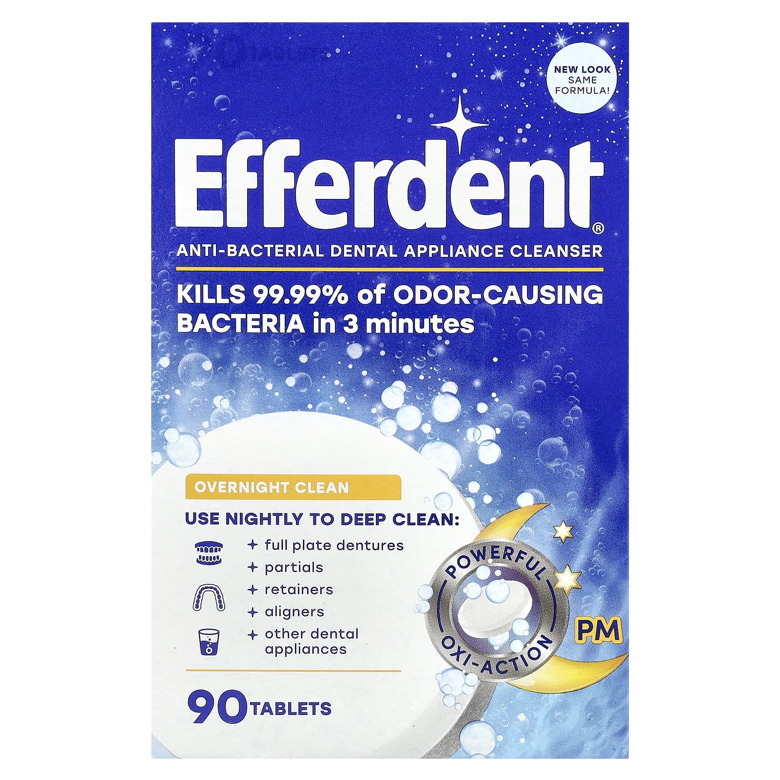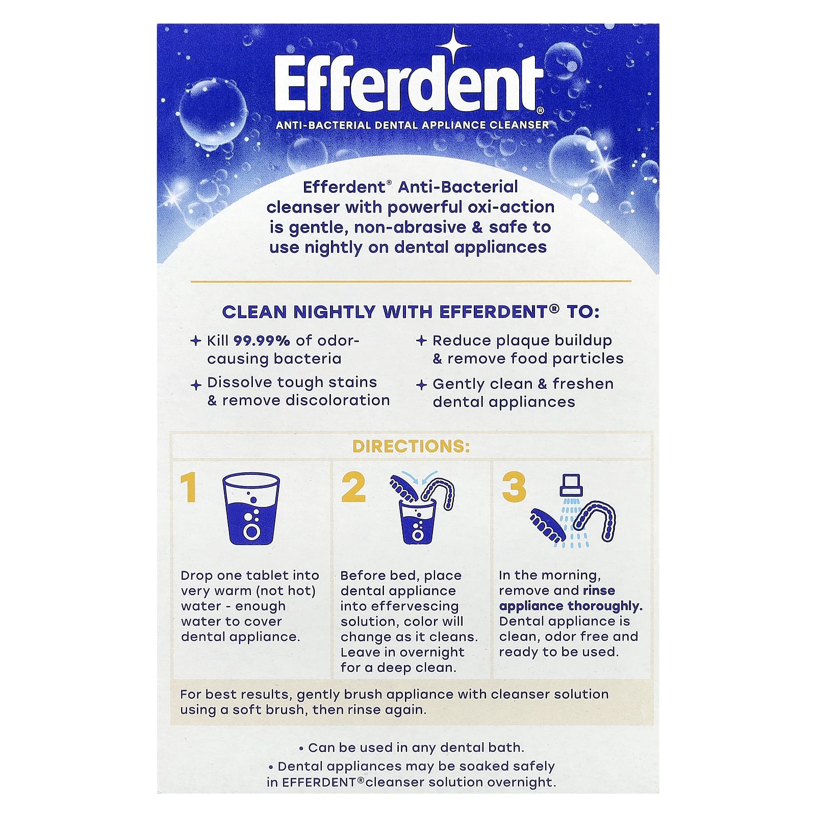 Антибактериальное очищающее средство Efferdent® с мощным окислительным действием, мягкое, неабразивное и безопасное средство для чистки зубов на ночь.