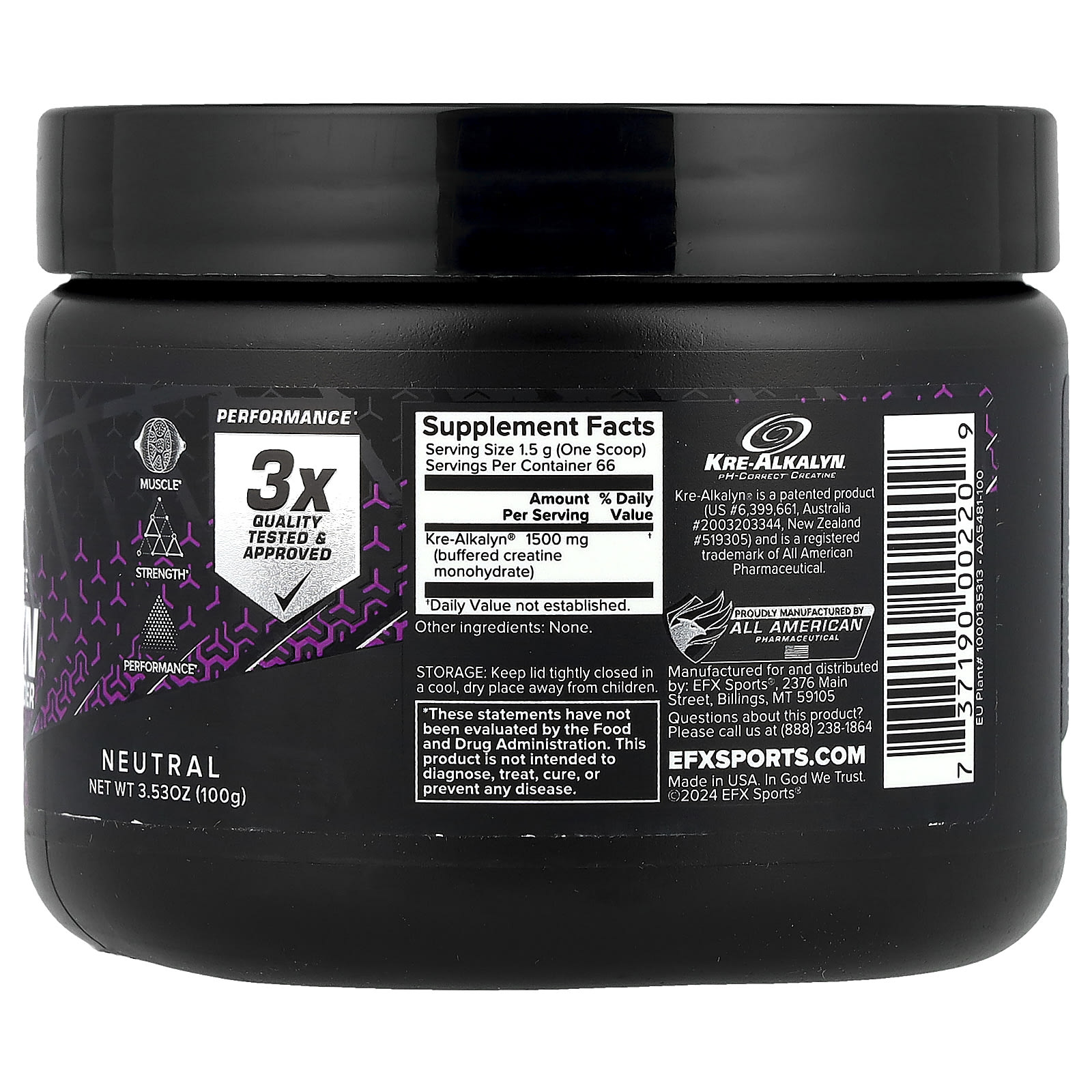 Kre-Alkalyn® EFX — это единственный на рынке моногидрат креатина с кислотностью рН 12, потому что его молекулы синтезируются посредством буферизации агентов с применением защищенного патентом (№ 6399661) производственного процесса, обеспечивающего необходимую кислотность.