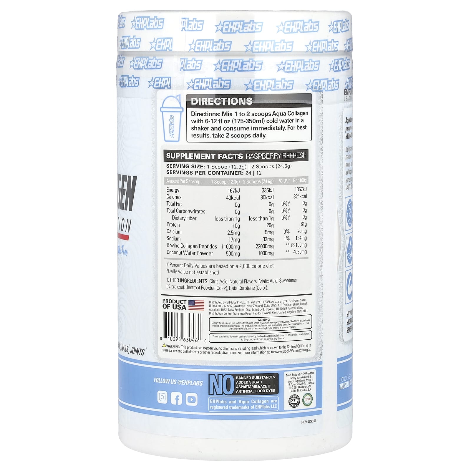 EHPlabs, Aqua Collagen, протеин и увлажнение, малиновое освежение, 295 г (10,4 унции)