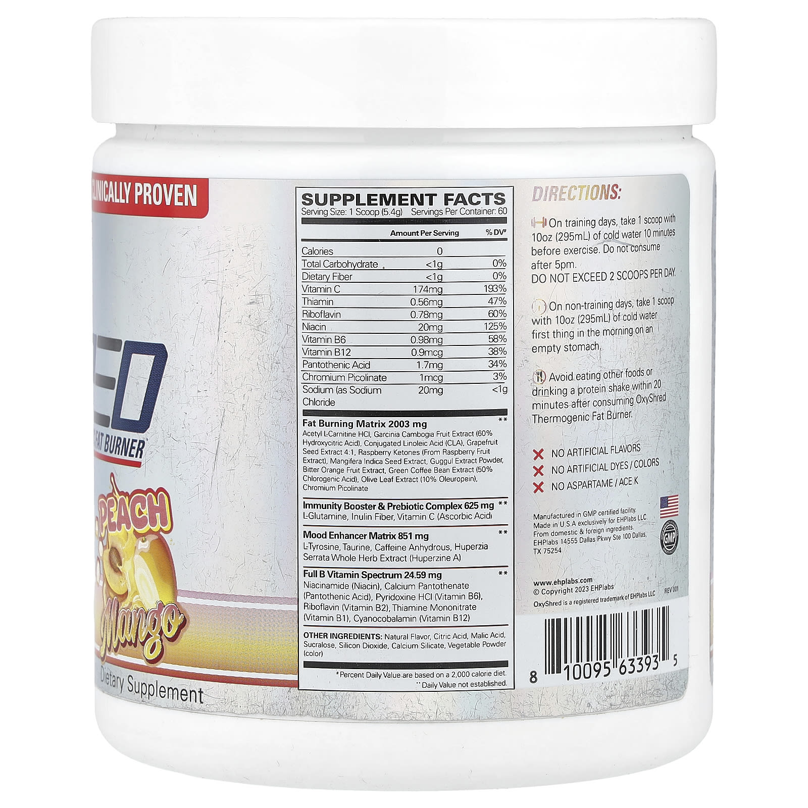 OxyShred Thermogenic Fat Burner - это пищевая добавка, которая содержит кофеин и не рекомендуется для людей, чувствительных к кофеину. Не предназначено для лиц младше 18 лет. Не превышайте рекомендуемую дозу. Проконсультируйтесь с врачом, если вы беременны или кормите грудью, принимаете лекарства или страдаете каким-либо заболеванием. Прекратите прием добавки за 2 недели до хирургической операции. Хранить в сухом и прохладном месте. Этот продукт не является единственным источником питания, и его следует употреблять в сочетании с полноценной диетой. Этот продукт следует использовать в сочетании с соответствующей программой физических тренировок или упражнений для обеспечения заявленной потери веса. Не используйте, если внешняя защитная пленка повреждена.