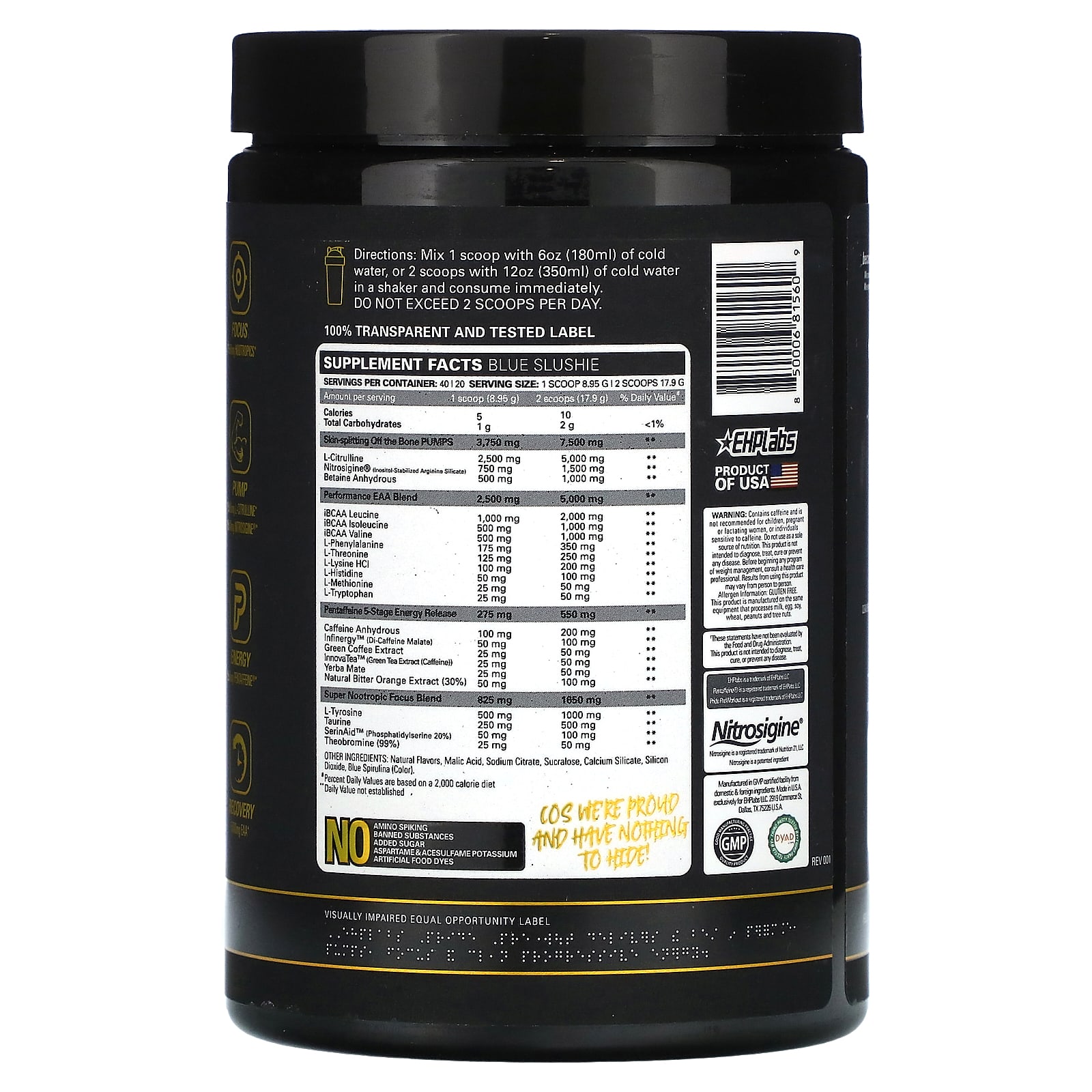 • 550 мг Pentaffeine® *, чистая энергия, прогрессивный 5-этапный процесс высвобождения кофеина и натуральный экстракт горького апельсина