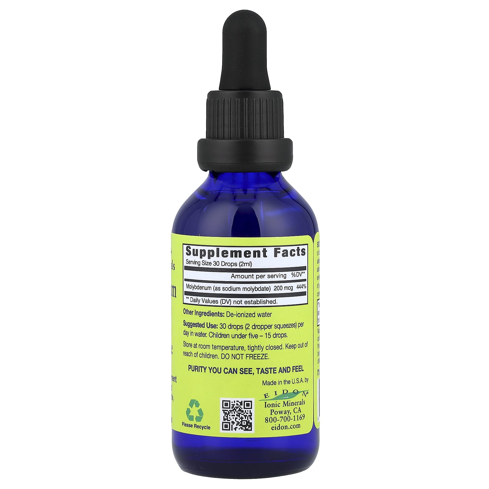 Молибден бренда Eidon необходим для активации по крайней мере трех важных ферментов в организме: 1) альдегидоксидаза — для обработки организмом альдегидов, которые он производит, и альдегидов, встречающихся в окружающей среде; 2) ксантиноксидаза для преобразования пуринов в мочевую кислоту; 3) сульфитоксидаза для преобразования раздражающих сульфитов в безвредные сульфаты.