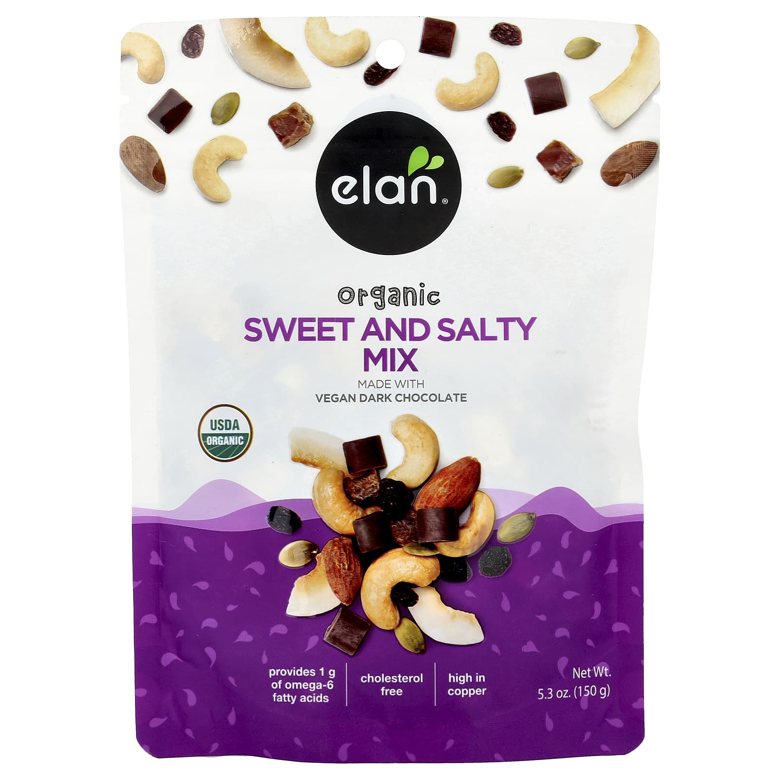 Сладко-соленая смесь Elan - это насыщенная смесь темного шоколада, органических фиников, изюма, кокосовой стружки, тыквенных семечек, кешью и миндаля, которые были слегка обжарены и идеально подсолены. Шоколад и фрукты - это небесная гармония. Это уникальное сочетание органических орехов, фруктов и шоколада удовлетворит самого взыскательного вкуса. А что лучше перекусить в длительном походе или прогулке? Эта смесь, наполненная орехами, фруктами, семенами и шоколадом, подарит вам удовольствие на свежем воздухе и легко переносится.