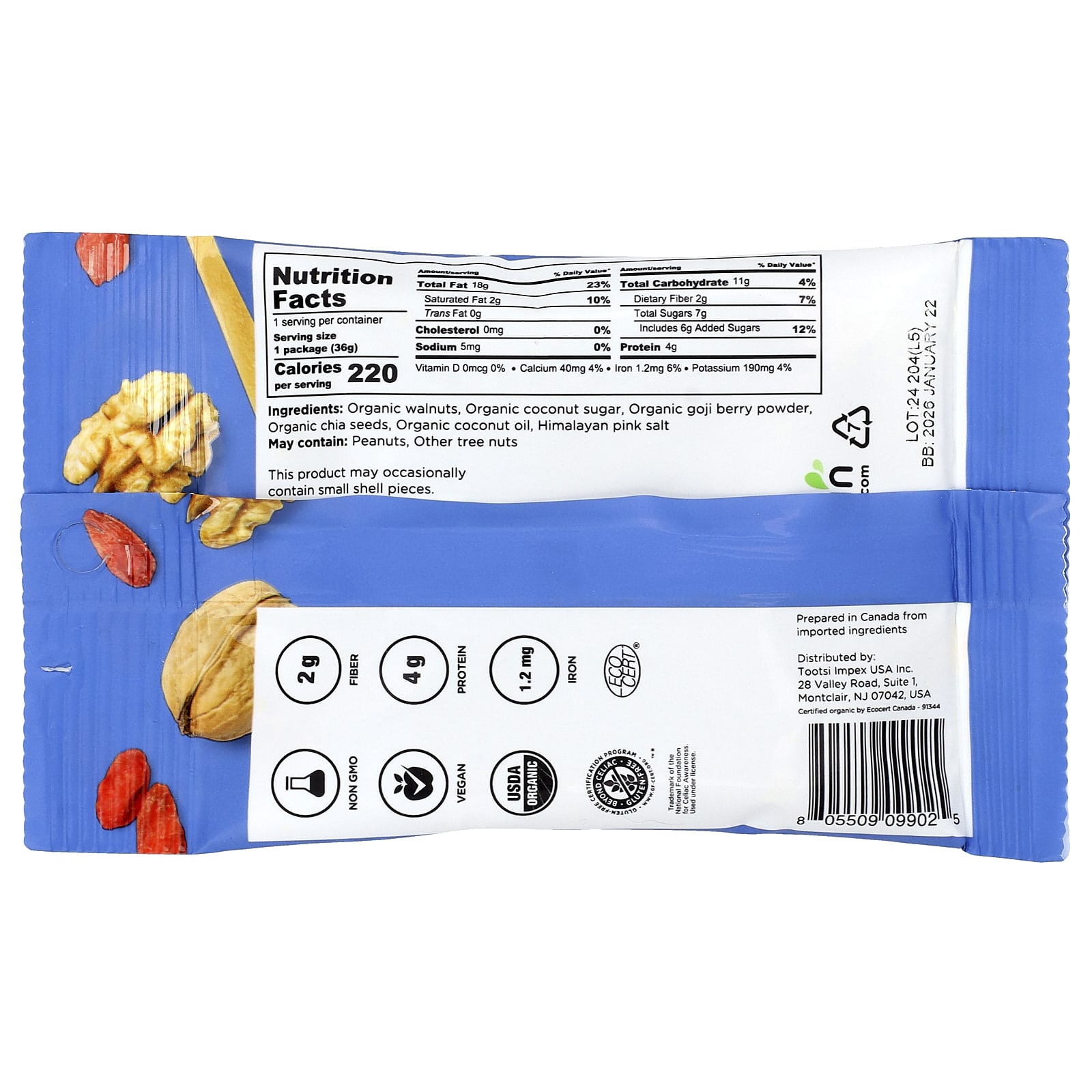 Органические грецкие орехи, органический кокосовый сахар, органический порошок из ягод годжи, органические семена чиа, органическое кокосовое масло, розовая гималайская соль.