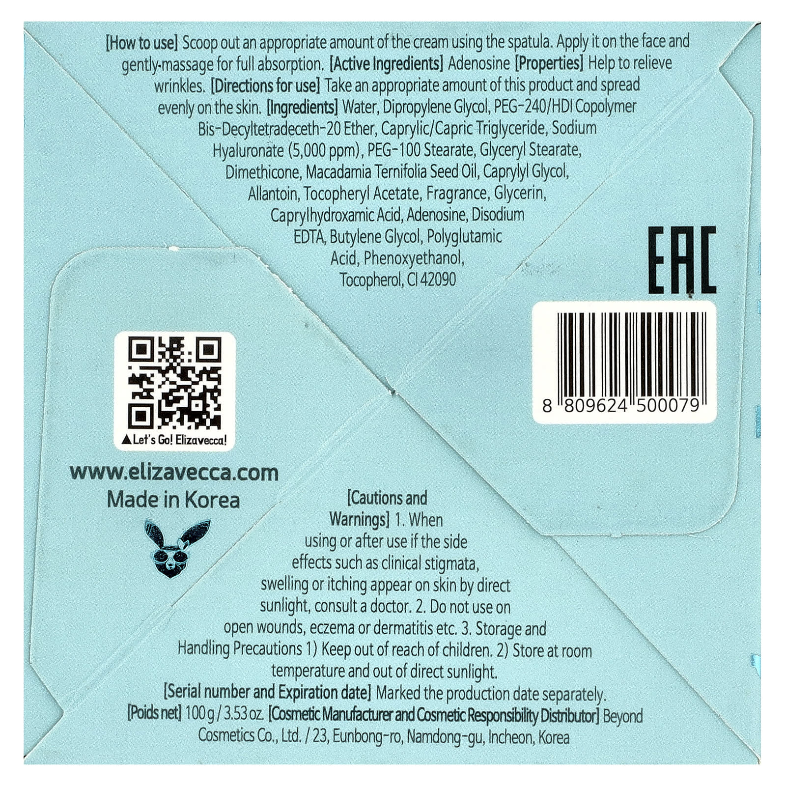 Вода, дипропиленгликоль, ПЭГ-240/HDI сополимер бис-децилтетрадецет-20 эфир, каприловый/каприновый триглицерид, гиалуронат (5000 мг), ПЭГ-100 стеарат, глицерил стеарат, диметикон, масло макадамии (Macadamia ternifolia), каприлилгликоль, аллантоин, токоферилацетат, отдушка, глицерин, каприлгидроксаминовая кислота, аденозин, двунатриевая ЭДТК, бутиленгликоль, полиглутаминовая кислота, феноксиэтанол, токоферол, CI 42090.
