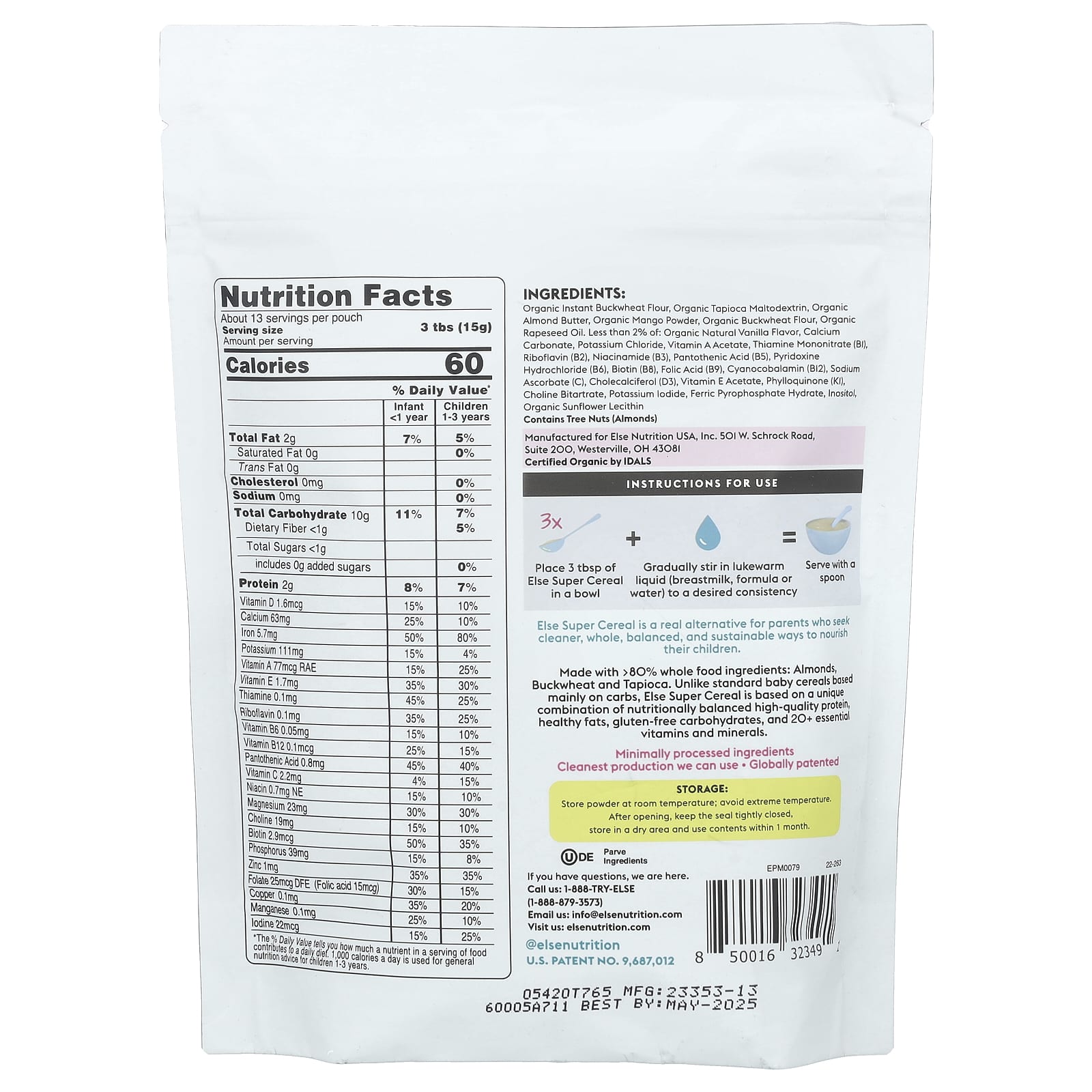 Сделано с >80% цельных пищевых ингредиентов: Миндаль, гречка и тапиока. В отличие от стандартных детских хлопьев, в основе которых лежат углеводы, Else Super Cereal состоит из уникального сочетания питательно сбалансированного высококачественного белка, полезных жиров, безглютеновых углеводов и более 20 незаменимых витаминов и минералов.