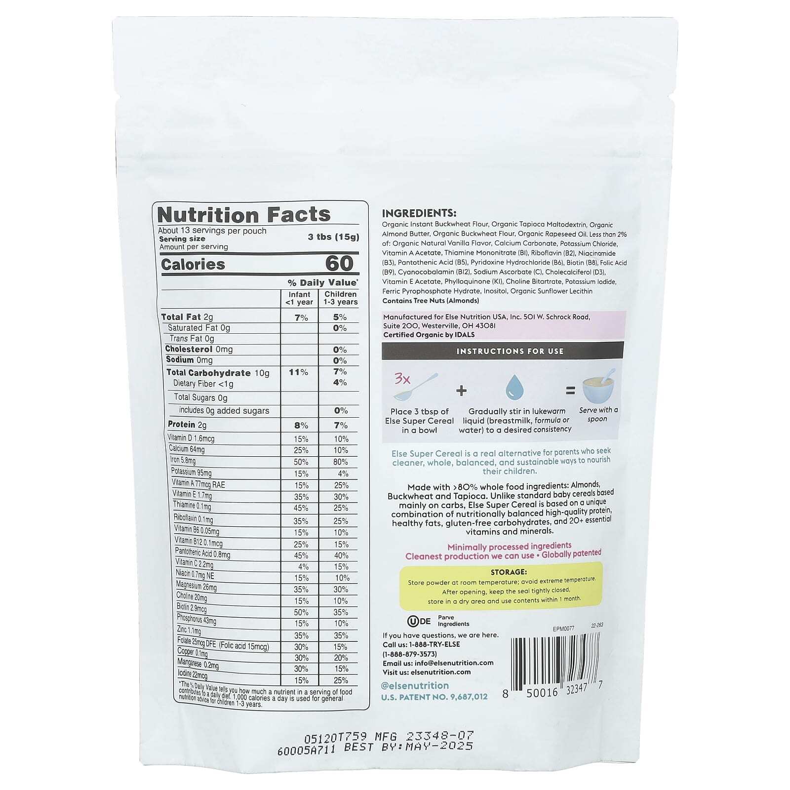 Сделано с >80% цельных пищевых ингредиентов: Миндаль, гречка и тапиока. В отличие от стандартных детских хлопьев, в основе которых лежат углеводы, Else Super Cereal состоит из уникального сочетания питательно сбалансированного высококачественного белка, полезных жиров, безглютеновых углеводов и более 20 незаменимых витаминов и минералов.