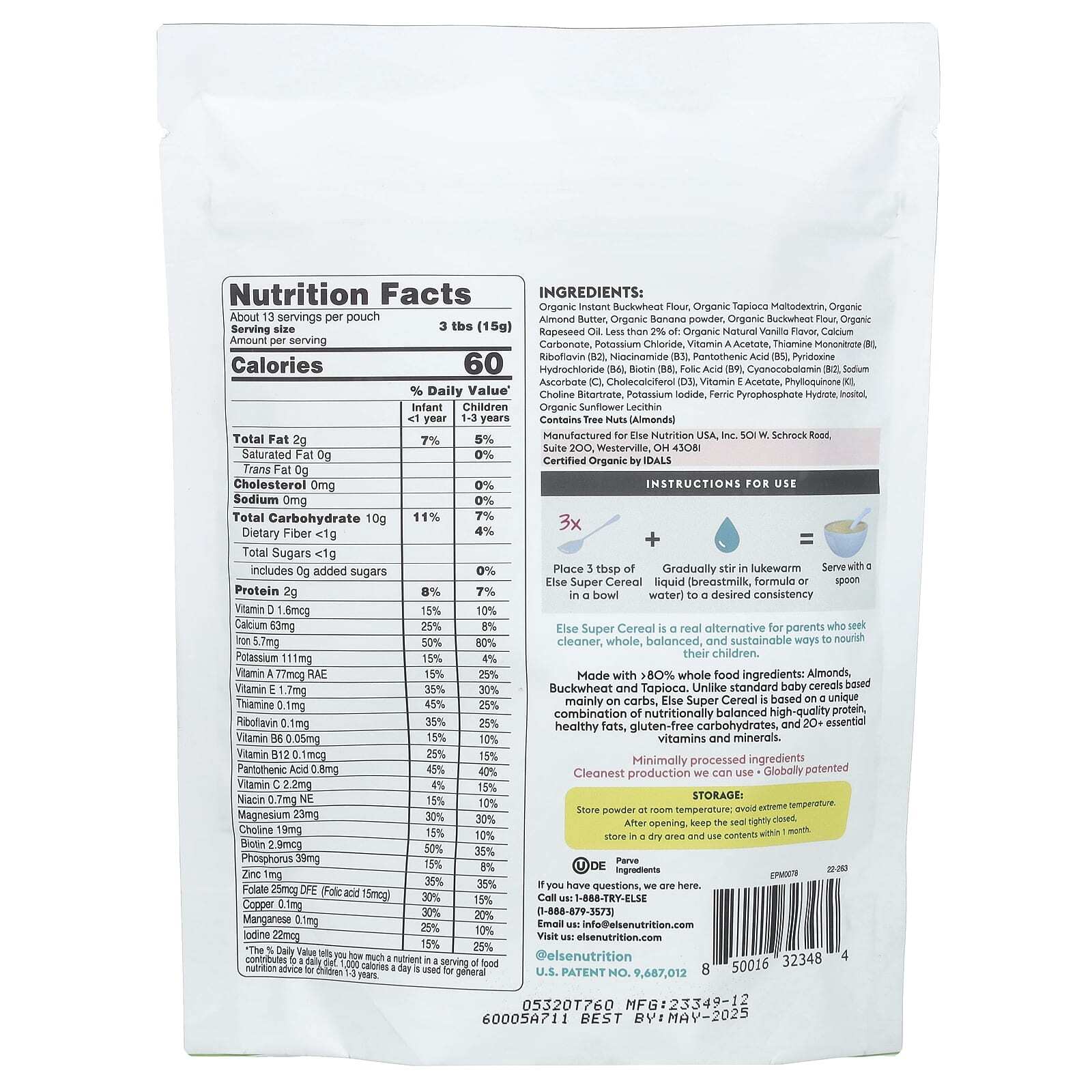 Сделано с >80% цельных пищевых ингредиентов: Миндаль, гречка и тапиока. В отличие от стандартных детских хлопьев, в основе которых лежат углеводы, Else Super Cereal состоит из уникального сочетания питательно сбалансированного высококачественного белка, полезных жиров, безглютеновых углеводов и более 20 незаменимых витаминов и минералов.