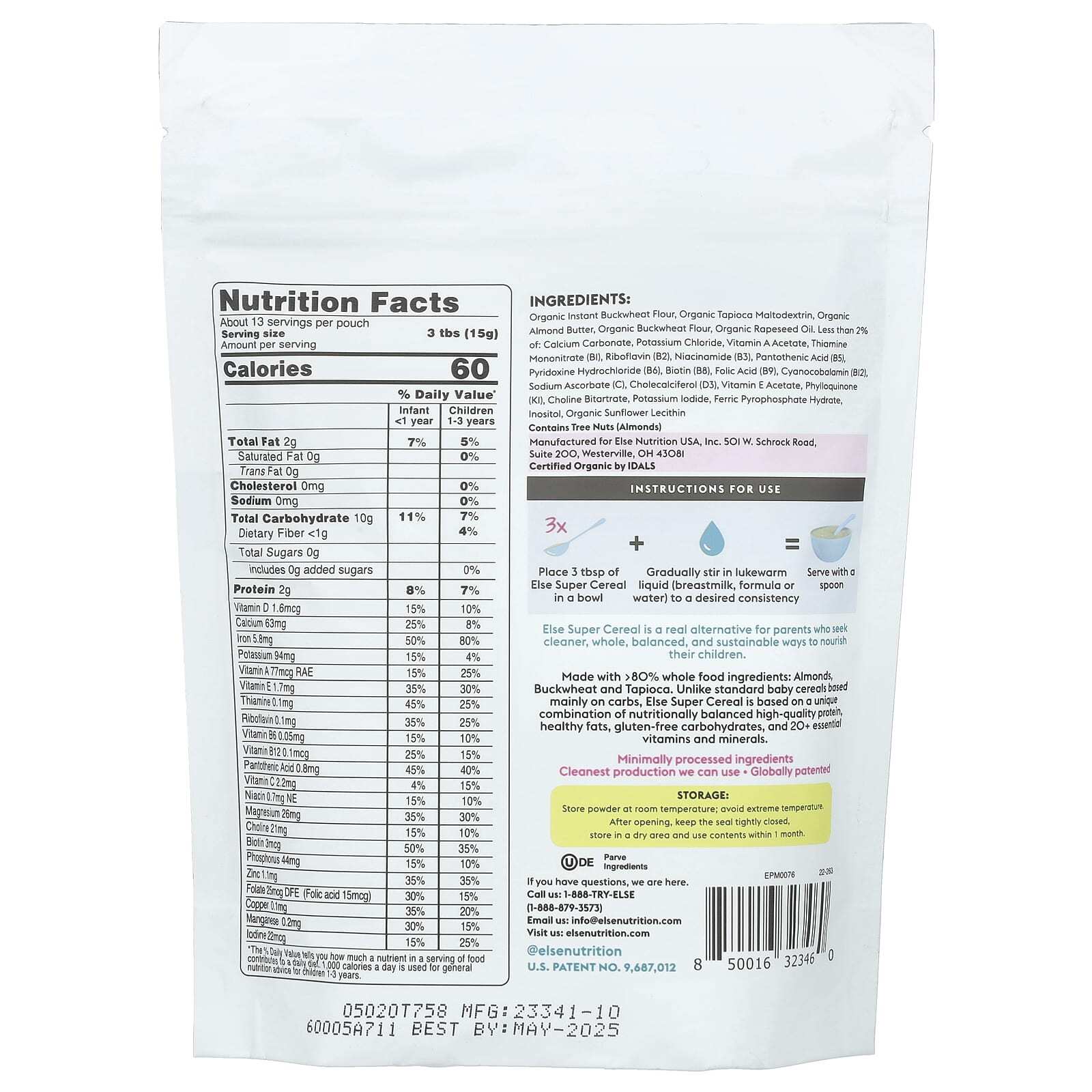 Сделано с >80% цельных пищевых ингредиентов: Миндаль, гречка и тапиока. В отличие от стандартных детских хлопьев, в основе которых лежат углеводы, Else Super Cereal состоит из уникального сочетания питательно сбалансированного высококачественного белка, полезных жиров, безглютеновых углеводов и более 20 незаменимых витаминов и минералов.