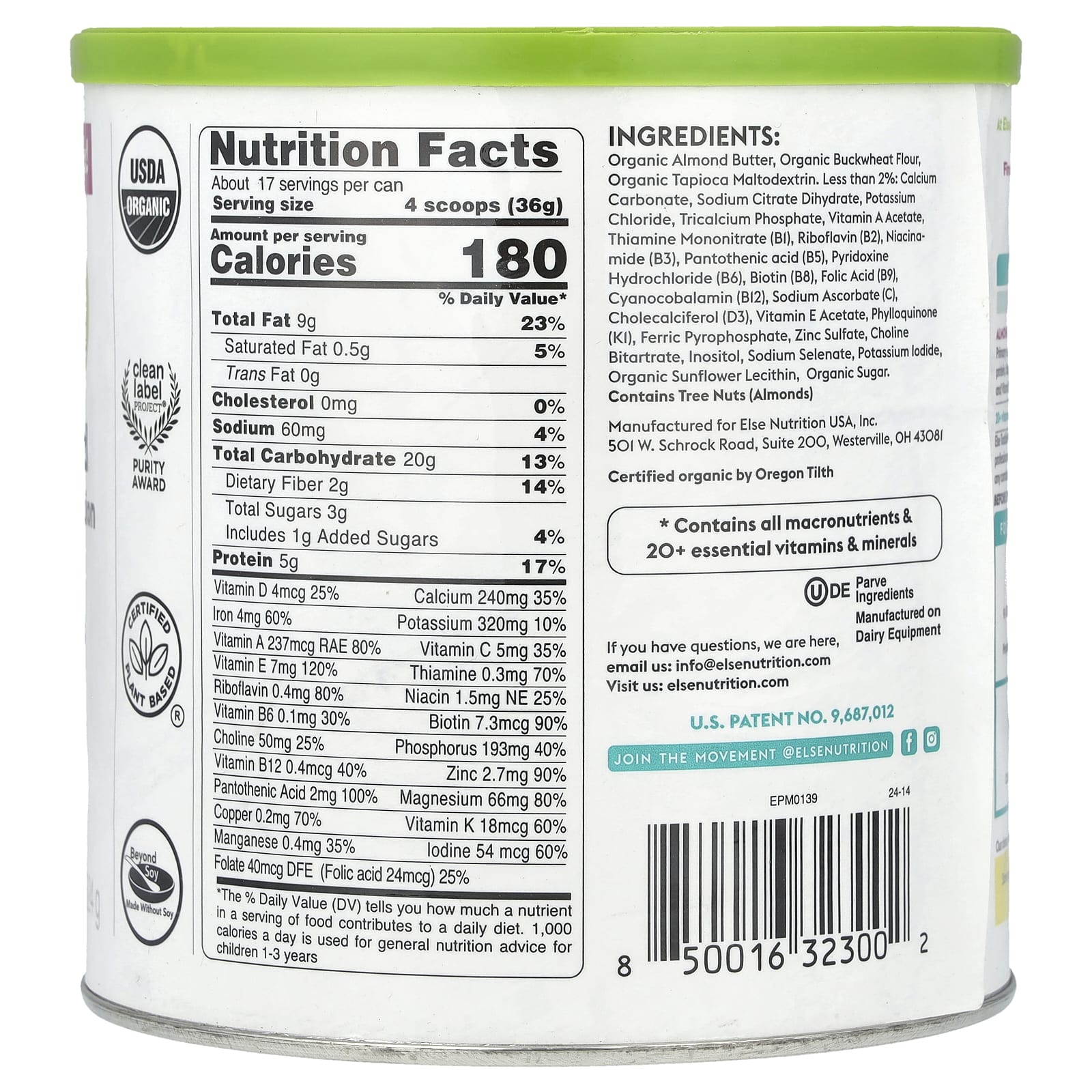 Органическая миндальная паста, органическая гречневая мука, органический мальтодекстрин из тапиоки. Содержит менее 2% следующих ингредиентов: карбонат кальция, дигидрат цитрата натрия, хлорид калия, трикальцийфосфат, ацетат витамина A, мононитрат тиамина (витамин B1), рибофлавин (витамин B2), никотинамид (витамин B3), пантотеновая кислота (витамин B5), пиридоксина гидрохлорид (витамин B6), биотин (витамин B8), фолиевая кислота (витамин B9), цианокобаламин (витамин B12), аскорбат натрия (витамин C), холекальциферол (витамин D3), ацетат витамина E, филлохинон (витамин K1), пирофосфат железа, сульфат цинка, битартрат холина, инозитол, селенат натрия, йодид калия, органический подсолнечный лецитин, органический тростниковый сахар.