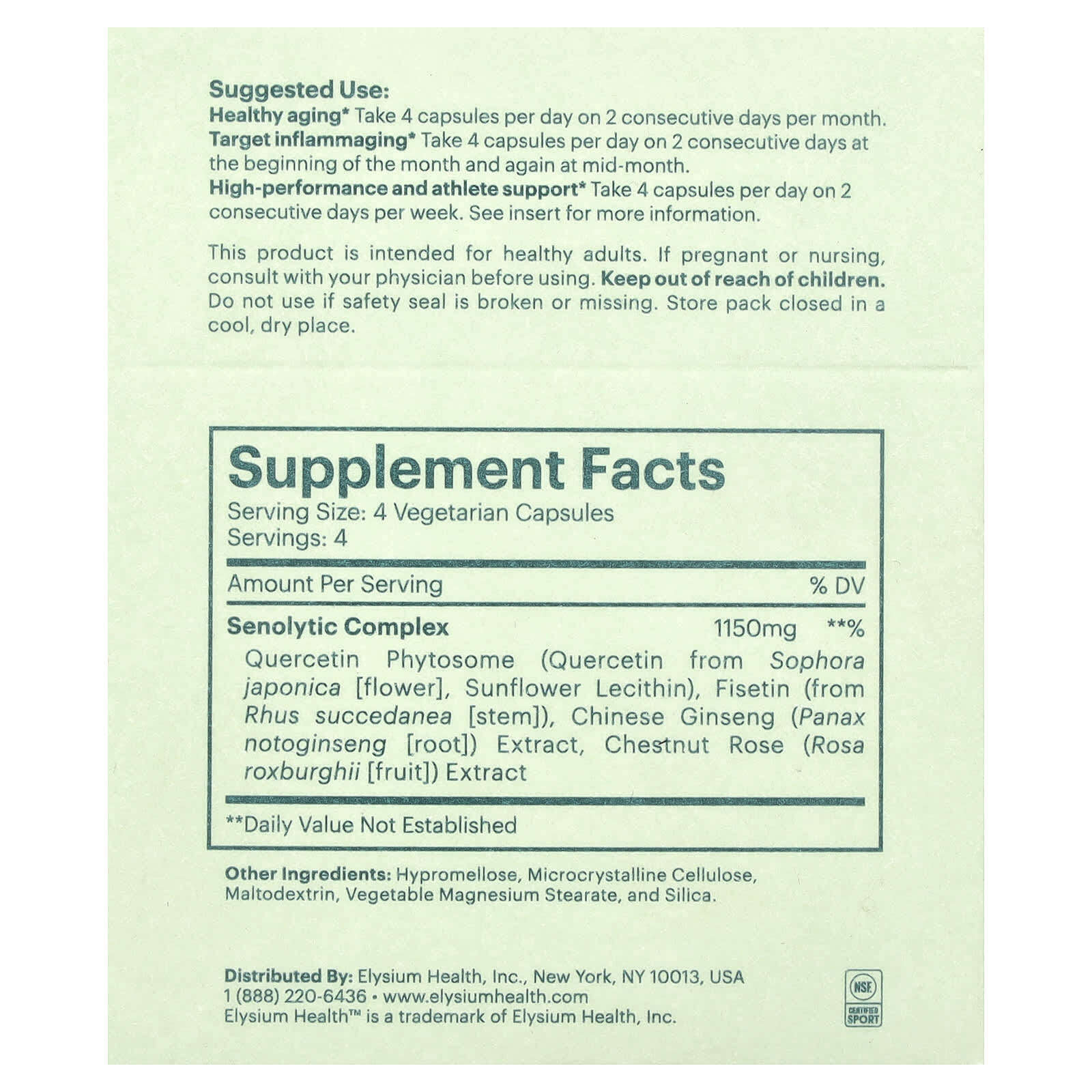 Сенолитический комплекс Фитосома кверцетина (кверцетин из софоры японской [цветок], лецитин подсолнечника), физетин (из стебля Rhus Succcedanea), экстракт китайского женьшеня (Panax notoginseng [корень]), экстракт каштановой розы (Rosa roxburghii [плоды]) | 1150 мг | **% |