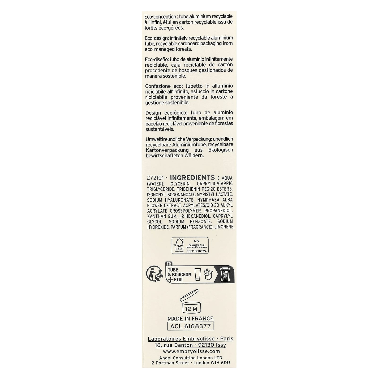 Вода, глицерин, каприловый/каприновый триглицерид, ПЭГ-20 эфиры трибехенин, изононил изононаноат, миристил лактат, гиалуронат натрия, экстракт цветков кувшинки белой (Nymphaea alba), акрилат/c10-30 алкил акрилат кроссполимер, пропандиол, ксантановая камедь, 1,2-гександиол, каприлилгликоль, бензоат натрия, гидроксид натрия, парфюмерная композиция (отдушка), лимонен.