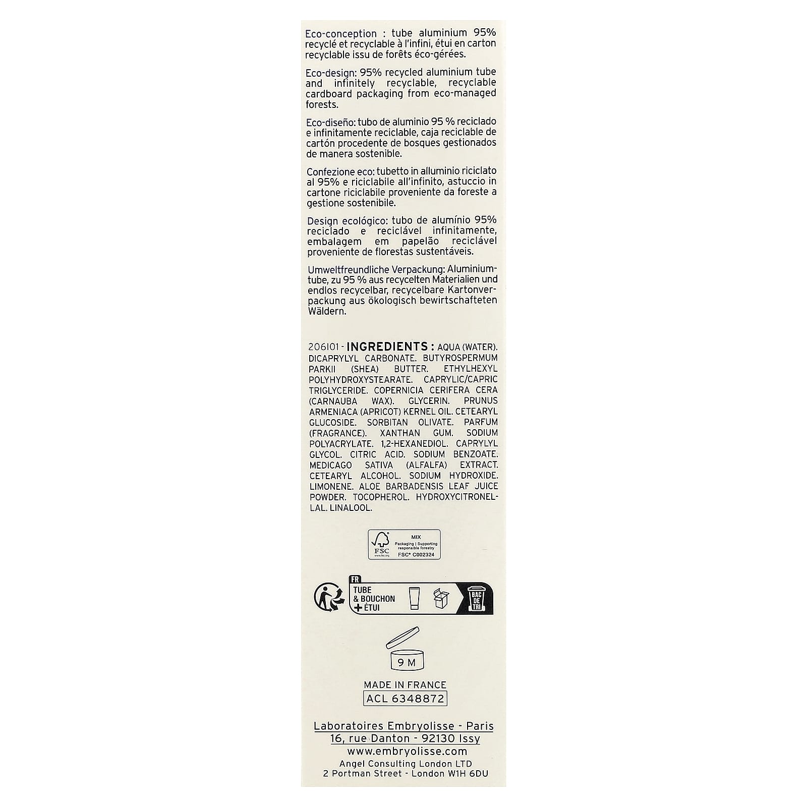 Вода (Aqua), дикаприлил карбонат, масло ши (Butyrospermum parkii), этилгексил полигидроксистеарат, каприловый/каприновый триглицерид, карнаубский воск (Copernicia cerifera), глицерин, масло из косточек абрикоса (Prunus armeniaca), цетеариловый глюкозид, сорбитан оливат, парфюмерная композиция (отдушка), ксантановая камедь, полиакрилат натрия, 1,2-гександиол, каприлилгликоль, лимонная кислота, бензоат натрия, экстракт люцерны (Medicago sativa), цетеариловый спирт, гидроксид натрия, лимонен, порошок из сока листьев алоэ вера (Aloe barbadensis), токоферол, гидроксицитронеллаль, линалоола.
