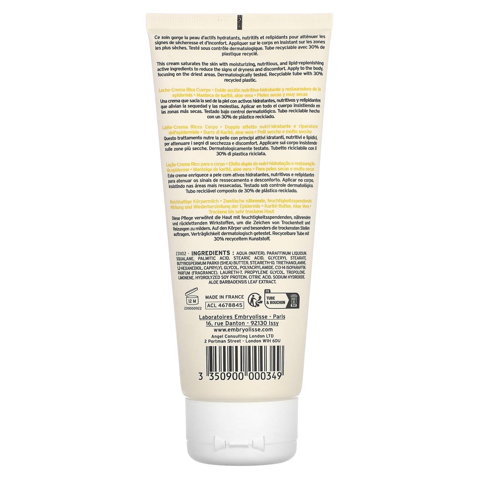 Вода, вазелиновое масло, сквалан, пальмитиновая кислота, стеариновая кислота, глицерил стеарат, масло ши (Butyrospermum parkii), стеарет-10, триэтаноламин, 12-гександиол, каприлилгликоль, полиакриламид, c13-14 изопарафин, парфюмерная композиция (отдушка), лаурет-7, пропиленгликоль, трополон, лимонен, гидролизованный белок из сои, лимонная кислота, гидроксид натрия, экстракт листьев алоэ вера.
