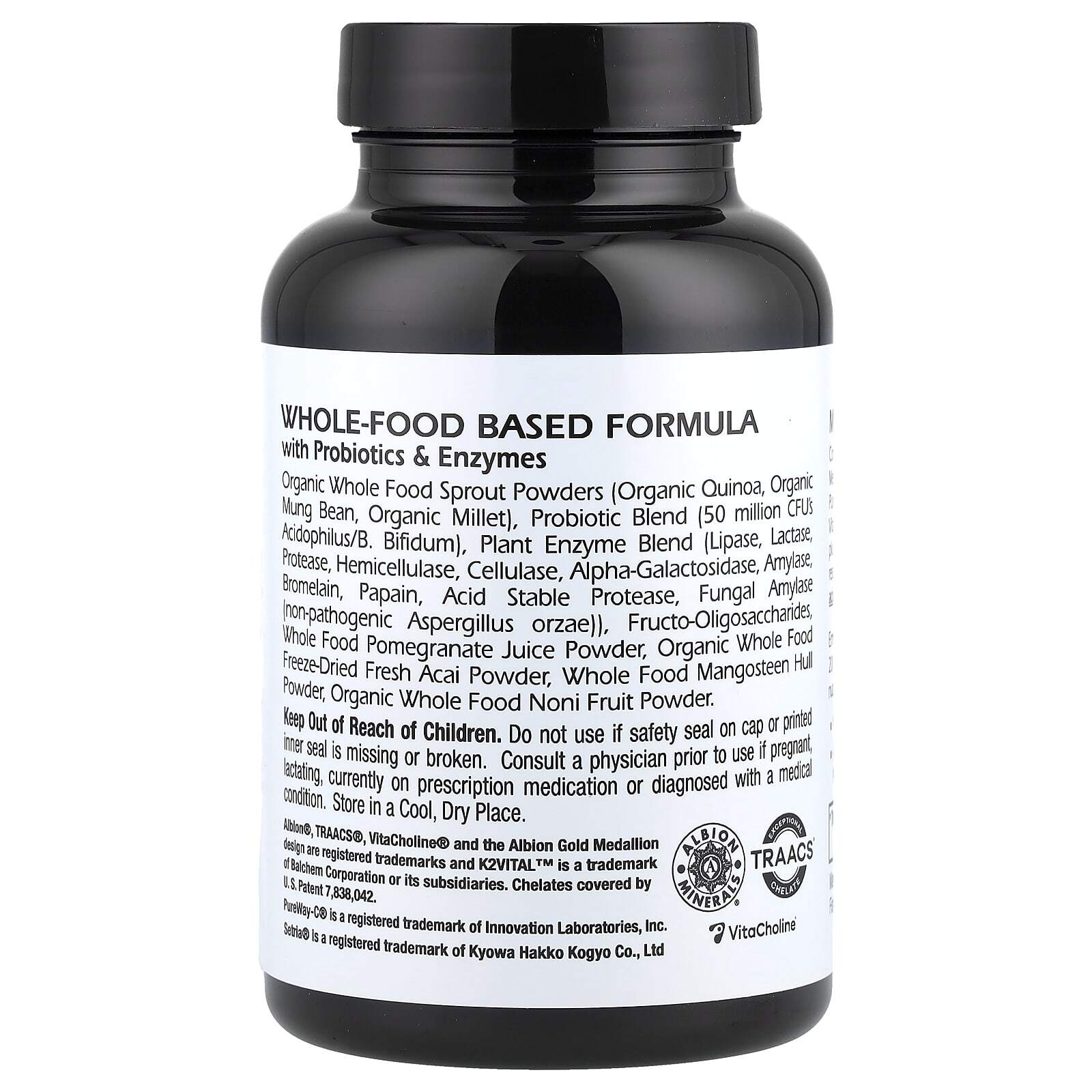 Порошки из органических цельных ростков (органическое киноа, органический маш, органическое просо), смесь пробиотиков (50 млн КОЕ ацидофилус/бифидобактерии бифидум (Bifidobacterium bifidum), смесь растительных ферментов (липаза, лактаза, протеаза, гемицеллюлаза, целлюлаза, альфа-галактозидаза, амилаза, бромелаин, папаин, кислотостойкая протеаза, грибковая амилаза (непатогенный аспергилл (Aspergillus orzae)), фруктоолигосахариды, порошок из цельнопищевого гранатового сока, органические сублимированные свежие порошки асаи из цельных продуктов, порошок из цельной шелухи гарцинии, органический порошок из цельных плодов нони.