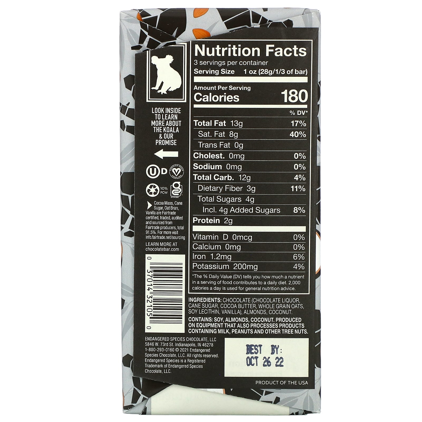 Шоколад (шоколадный ликер, тростниковый сахар, какао-масло, цельнозерновой овес, лецитина из сои, ваниль), миндаль, кокос.