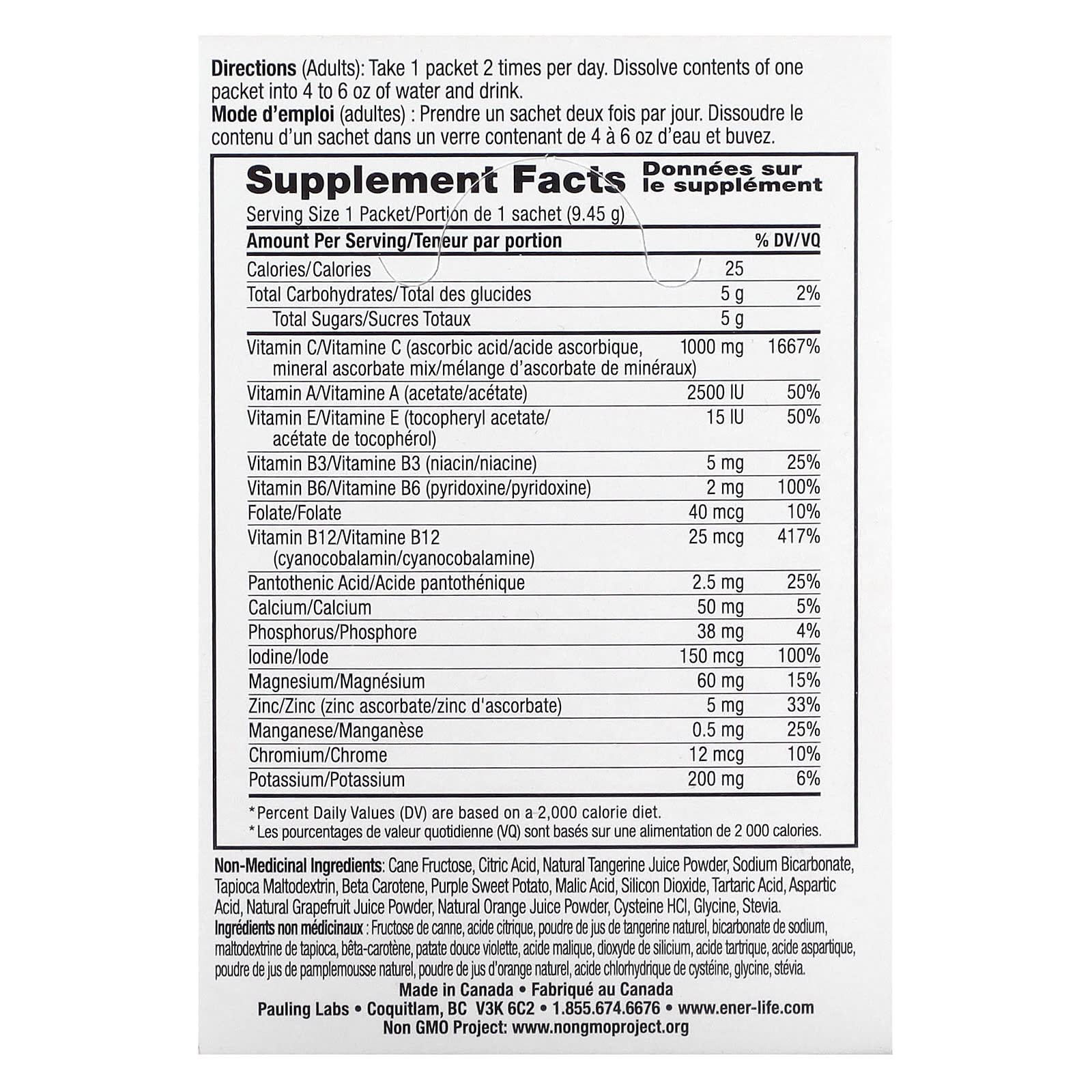 фруктоза из сахарного тростника, лимонная кислота, порошок из натурального мандарина, бикарбонат натрия, тапиока мальтодекстрин, бета-каротин, фиолетовый батат, яблочная кислота, диоксид кремния, винная кислота, аспарагиновая кислота, порошок из натурального сока грейпфрута, порошок из натурального апельсинового сока, цистеин гидрохлорид, глицин, стевия.