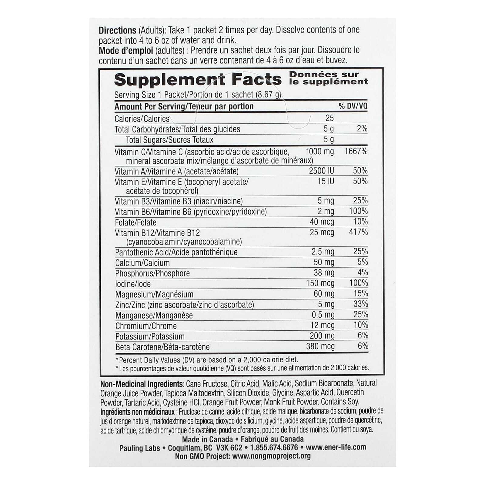 Натуральные ингредиенты: фруктоза из сахарного тростника, лимонная кислота, яблочная кислота, бикарбонат натрия, натуральный порошок из апельсинового сока, мальтодекстрин из тапиоки, диоксид кремния, глицин, аспарагиновая кислота, кверцетин в порошке, винная кислота, цистеин гидрохлорид, апельсиновый порошок, порошок архата.