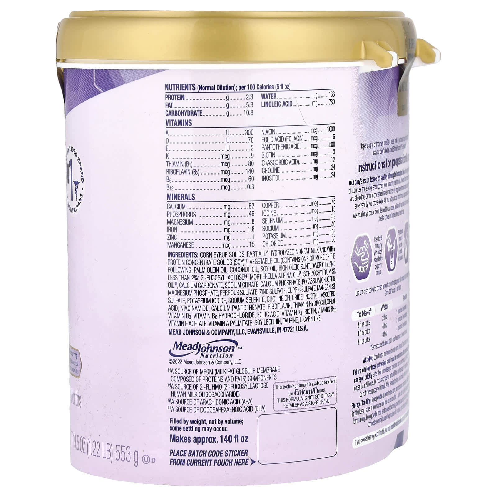 Хранение и обращение: Хранить порошок при комнатной температуре; избегать экстремальных температур. После вскрытия хранить плотно закрытой крышкой в сухом месте и использовать в течение 1 месяца. Используйте тубу только с формулой Enfamil NeuroPro Gentlease. Сохраняйте порошок свежим и предотвращайте рост бактерий, убедившись, что ванночка чистая и полностью сухая. Полностью опорожните ванну и протрите чистой сухой тканью перед повторным наполнением.