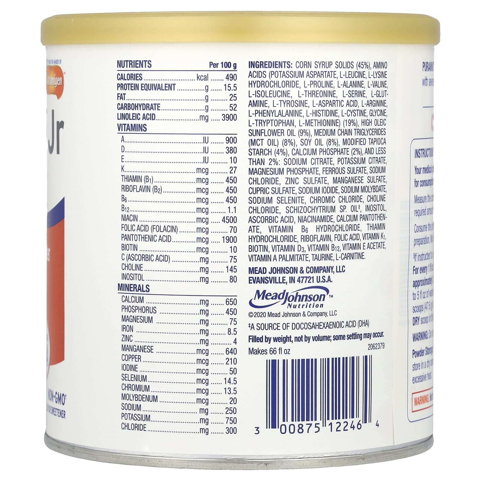 Сухие вещества кукурузного сиропа (45%), аминокислоты (аспартат калия, L-лейцин, L-лизина гидрохлорид, L-пролин, l-аланин, L-валин, l-изолейцин, L-треонин, L-серин, l-глутамин, L-тирозин, L-аспарагиновая кислота, l-аргинин, l-фенилаланин, l-гистидин, l-цистин, глицин, L-триптофан, l-метионин) (19%), высокоолеиновое подсолнечное масло (9%), среднецепочечные триглицериды (масло mct) (8%), соевое масло (8%), модифицированный тапиоковый крахмал (4%), фосфат кальция (2%), и менее 2%: цитрат натрия, цитрат калия, фосфат магния, сульфат железа, хлорид натрия, сульфат цинка, сульфат марганца, сульфат меди, йодид натрия, молибдат натрия, селенит натрия, хлорид хрома, холин хлорид, Schizochytrium sp. масло +, инозитол, аскорбиновая кислота, никотинамид, пантотенат кальция, витамин B6 гидрохлорид, тиамина гидрохлорид, рибофлавин, фолиевая кислота, витамин K1, биотин, витамин D3, витамин B12, ацетат витамина E, витамин A (пальмитат), таурин, L-карнитин.
