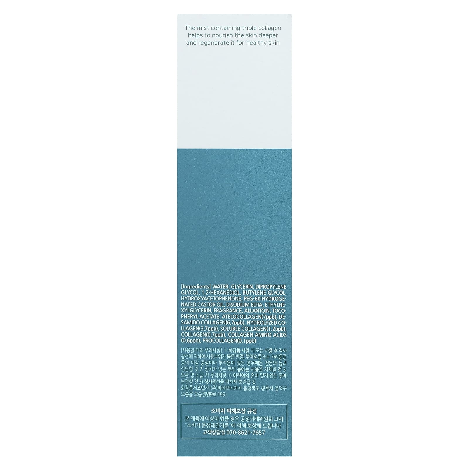 Вода, глицерин, дипропиленгликоль, 1,2-гександиол, бутиленгликоль, гидроксиацетофенон, ПЭГ-60 гидрогенизированное касторовое масло, двунатриевая ЭДТК, этилгексилглицерин, отдушка, аллантоин, токоферилацетат, ателоколлаген (7 част. / млрд), дезамидо коллаген (6,7 част. / млрд), гидролизованный коллаген (3,7 част. / млрд), растворимый коллаген (1,2 част. / млрд), коллаген (0,7 част. / млрд), аминокислоты коллагена (0,6 част. / млрд), проколлаген (0,1 част. / млрд).
