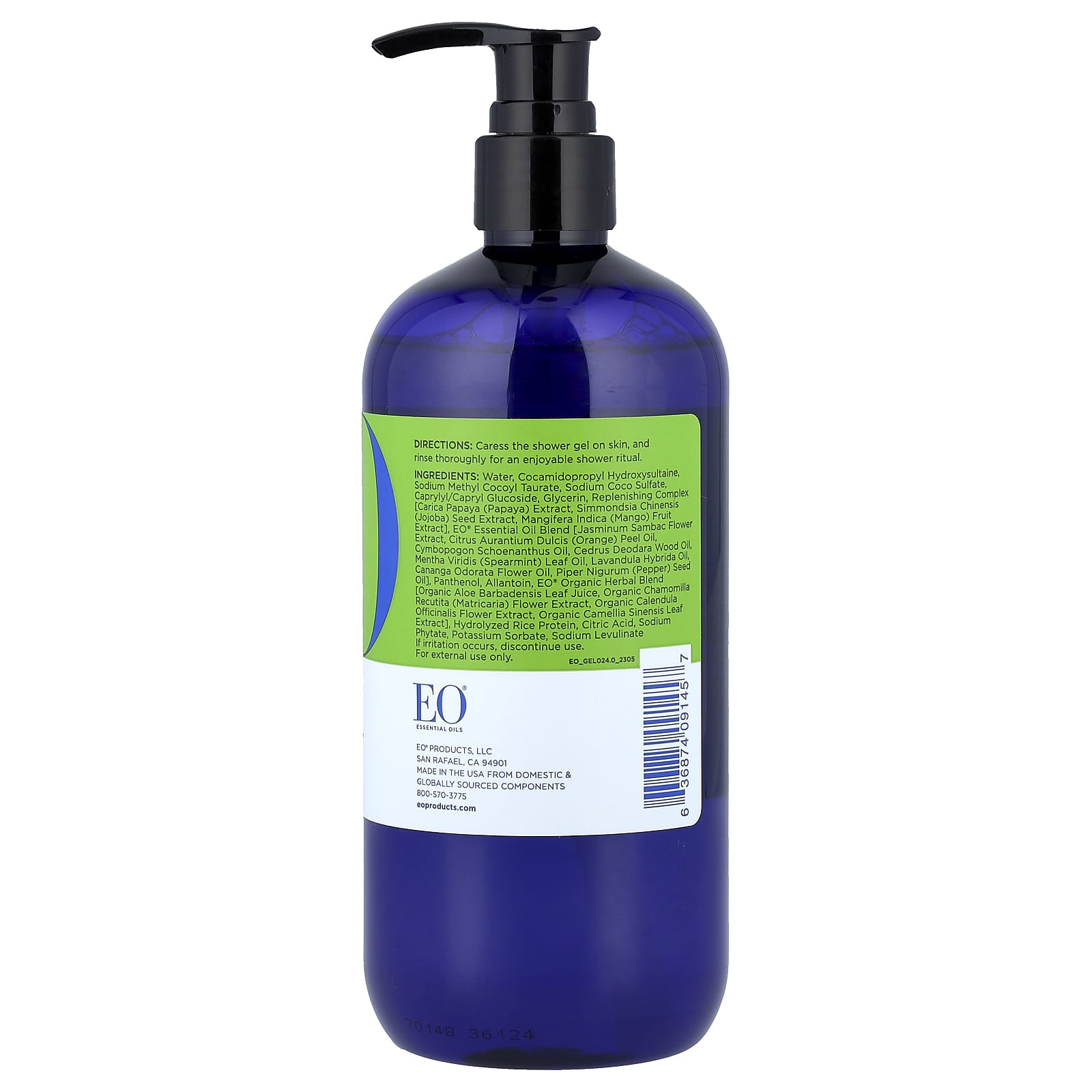 Вода, кокамидопропил гидроксисултаин, натрия метил кокоил таурат, кокосульфат натрия, каприлил/каприл глюкозид, глицерин, Восстанавливающий комплекс [экстракт папайи (Carica papaya), экстракт семян жожоба (Simmondsia chinensis), экстракт плодов манго (Mangifera indica)], Смесь эфирных масел EO® [экстракт цветков жасмина, масло из цедры апельсина (Citrus aurantium dulcis), масло лемонграсса (Cymbopogon schoenanthus), древесное масло кедра деодара (Cedrus deodora), масло из листьев мяты колосистой (Mentha viridis), масло лаванды гибридной (Lavandula hybrida), масло из цветков иланг-иланга (Cananga odorata), масло из семян перца (Piper nigurum)], пантенол, аллантоин, органическая травяная смесь EO® [сок листьев органического алоэ вера (Aloe barbadensis), экстракт цветков органической ромашки (Chamomilla recutita), Органический экстракт цветков календулы (Calendula officinalis), органический экстракт листьев зеленого чая (Camellia sinensis)], гидролизованный рисовый белок, лимонная кислота, фитат натрия, сорбат калия, левулинат натрия.