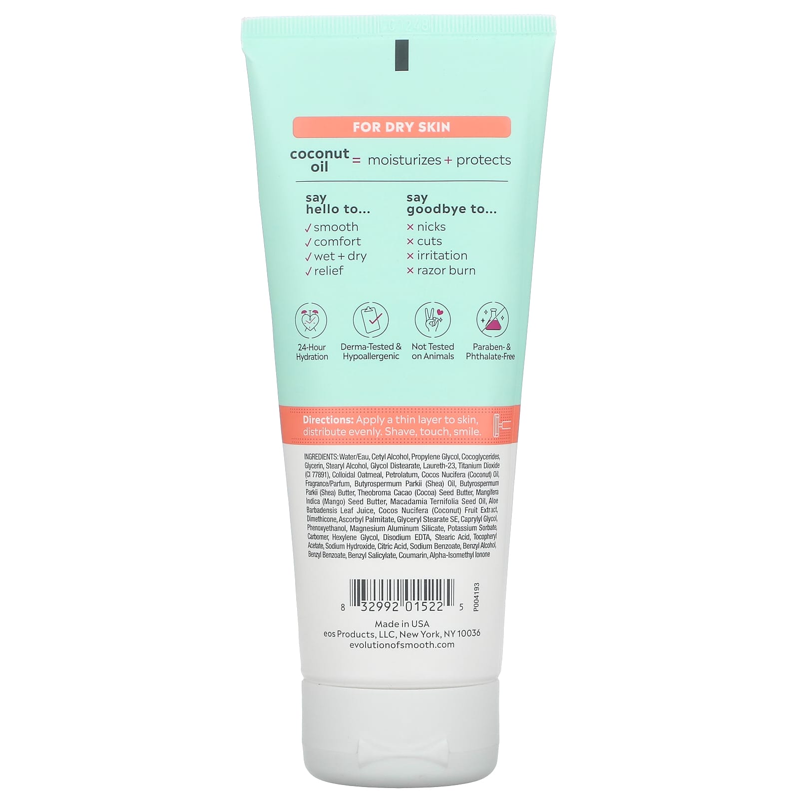 Вода, цетиловый спирт, пропиленгликоль, глицериды кокосового масла, глицерин, стеариловый спирт, гликоль дистеарат, лаурет-23, диоксид титана (CI 77891), коллоидная овсянка, вазелин, кокосовое масло (Cocos nucifera), отдушка, масло ши (Butyrospermum parkii), масло ши (Butyrospermum parkii), масло зерен какао (Theobroma cacao), масло косточек манго (Mangifera indica), масло макадамии (Macadamia ternifolia), сок листьев алоэ вера (Aloe barbadensis), экстракт кокоса (Cocos nucifera), диметикон, аскорбил пальмитат, глицерил стеарат эмульгирующий, каприлилгликоль, феноксиэтанол, алюмосиликат магния, сорбат калия, карбомер, гексиленгликоль, двунатриевая ЭДТК, стеариновая кислота, токоферилацетат, гидроксид натрия, лимонная кислота, бензоат натрия, бензиловый спирт, бензилбензоат, бензилсалицилат, кумарин, альфа-изометилионон.