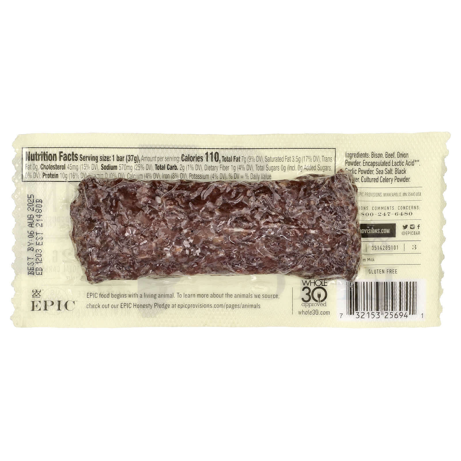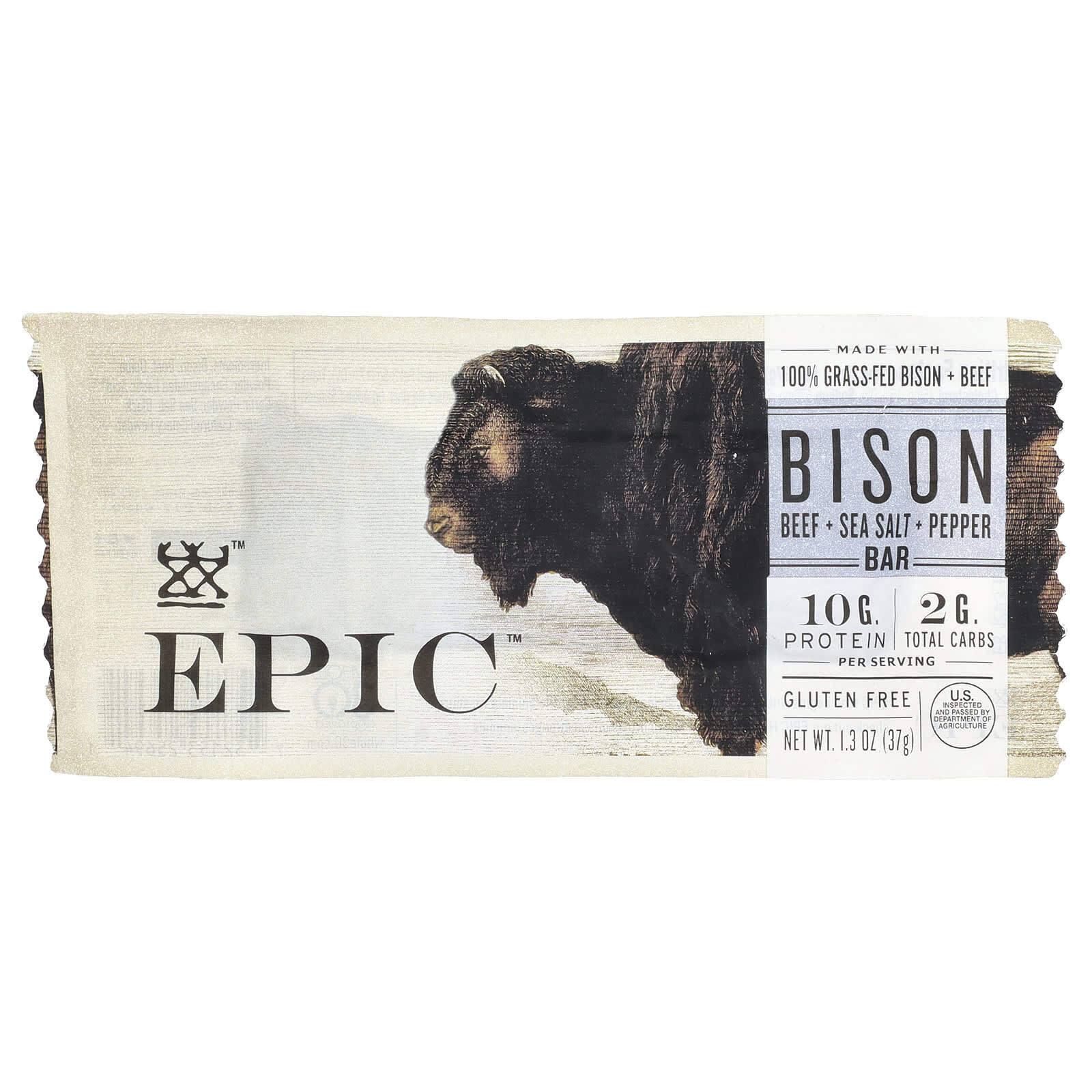 Бизоны, выращенные на 100% травой. 100% говядина травяного откорма. 100% ЭПИЧЕСКИЙ. Батончик с морской солью и перцем из говядины бизона на травяном откорме EPIC содержит 10 г белка и 2 г углеводов.