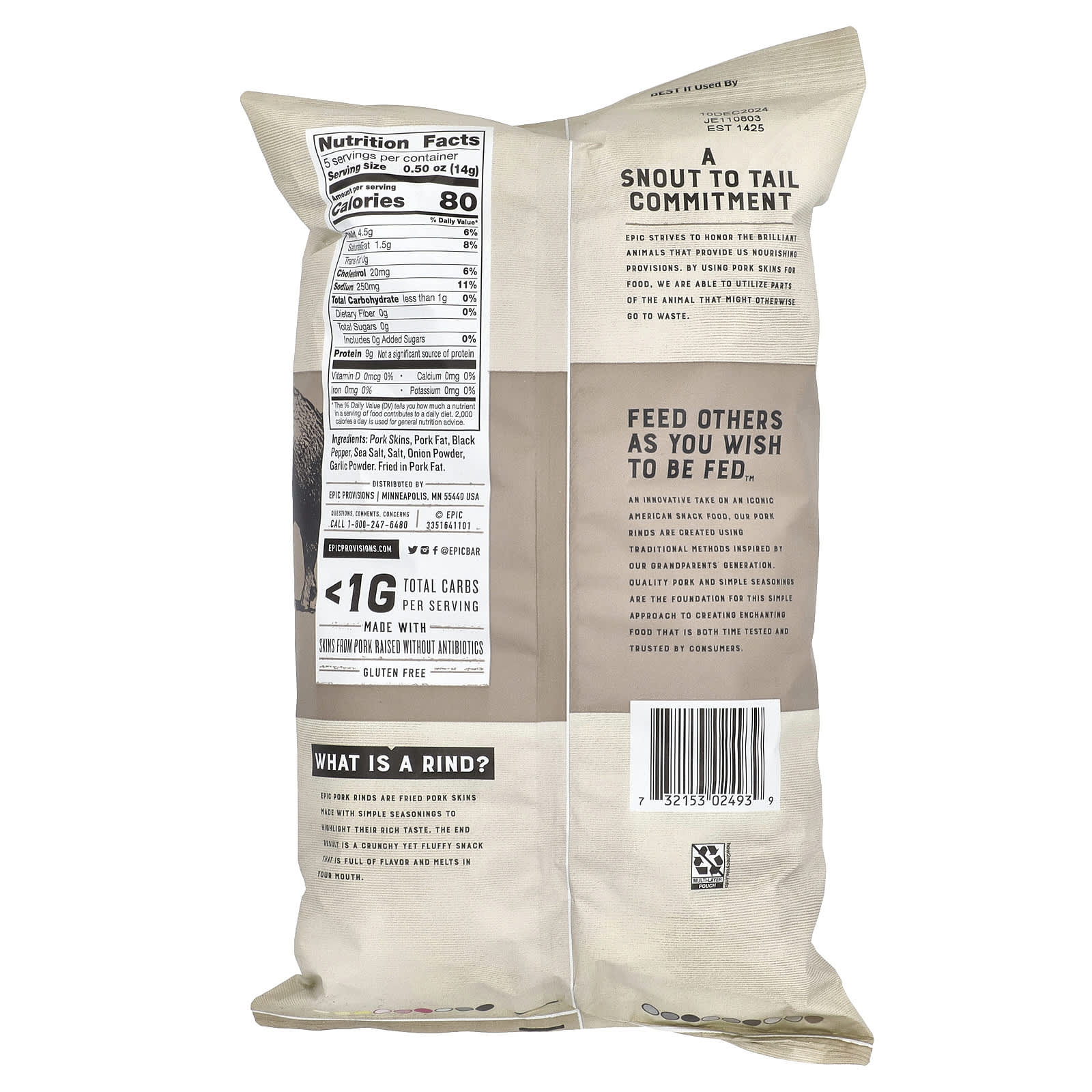 Свиные шкурки Epic — это обжаренные свиные шкурки, приготовленные с использованием простых приправ, которые подчеркивают их насыщенный вкус. Конечный результат — хрустящая, но нежная закуска с насыщенным вкусом, которая тает во рту.