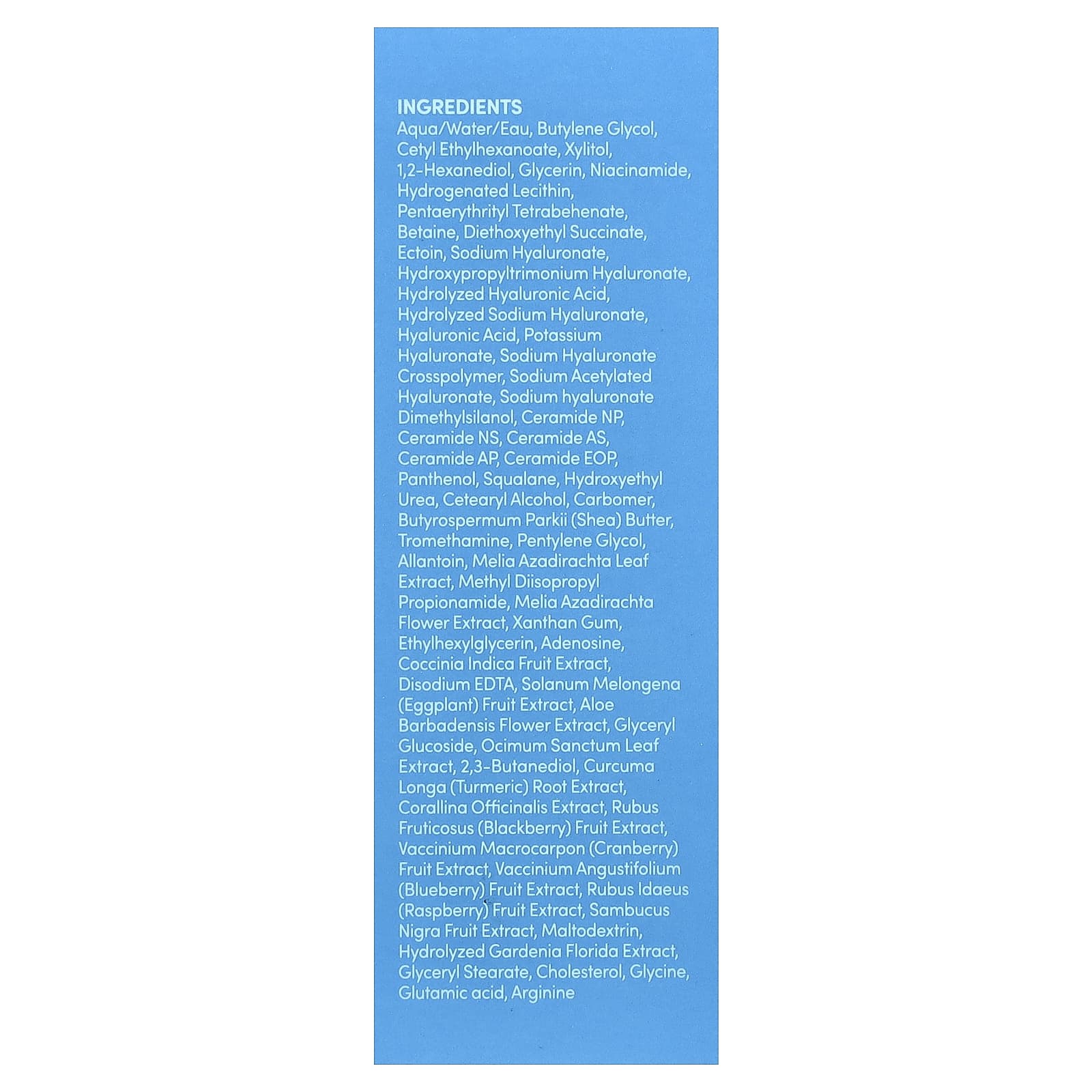 Вода, бутиленгликоль, цетилэтилгексаноат, ксилитол, 1,2-гександиол, глицерин, никотинамид, гидрогенизированный лецитин, пентаэритритил тетрабегенат, бетаин, диэтоксиэтил сукцинат, эктоин, гиалуронат натрия, гиалуронат гидроксипропилтримония, гидролизованная гиалуроновая кислота, гидролизованный гиалуронат натрия, гиалуроновая кислота, гиалуронат калия, кроссполимер гиалуроната натрия, ацетилированный гиалуронат натрия, гиалуронат натрия диметилсиланол, керамид NP, керамид NS, керамид AS, керамид АP, керамид EOP, пантенол, сквалан, гидроксиэтилированная мочевина, цетеариловый спирт, карбомер, масло ши (Butyrospermum parkii), трометамин, пентилен гликоль, аллантоин, экстракт листьев дерева ним (Melia azadirachta), метил диизопропил пропионамид, экстракт цветков дерева ним (Melia azadirachta), ксантановая камедь, этилгексилглицерин, аденозин, экстракт плодов кокцинии индийской (Coccina indica), двунатриевая ЭДТК, экстракт плодов баклажана (Solanum melongena), экстракт цветков алоэ вера (Aloe barbadensis), глицерил глюкозид, экстракт листьев туласи (Ocimum sanctum), 2,3-бутандиол, экстракт корня куркумы (Curcuma longa), экстракт кораллины лекарственной (Corallina officinalis), экстракт ягод ежевики (Rubus fructicosus), экстракт ягод клюквы (Vaccinium macrocarpon), экстракт ягод голубики (Vaccinium angustifolium), экстракт ягод малины (Rubus idaeus), экстракт плодов черной бузины (Sambucus nigra), мальтодекстрин, гидролизованный экстракт гардении жасминовидной (Gardenia florida), глицерил стеарат, холестерина, глицин, глутаминовая кислота, аргинин.