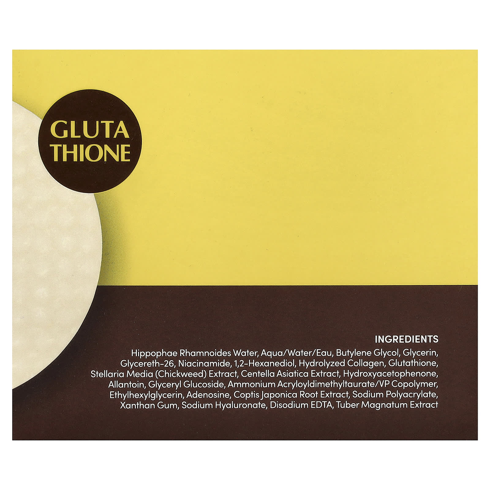 Вода из облепихи (Hippophae rhamnoides), вода (Aqua/eau), бутиленгликоль, глицерин, глицерет-26, никотинамид, 1,2-гександиол, гидролизованный коллаген, глутатион, экстракт звездчатки (Stellaria media), экстракт готу колы (Centella asiatica), гидроксиацетофенон, аллантоин, глицерил глюкозид, аммоний акрилоилдиметилтаурат/ВП сополимер, этилгексилглицерин, аденозин, экстракт корня коптиса японского (Coptis japonica), полиакрилат натрия, ксантановая камедь, гиалуронат натрия, двунатриевая ЭДТК, экстракт белого трюфеля (Tuber magnatum).