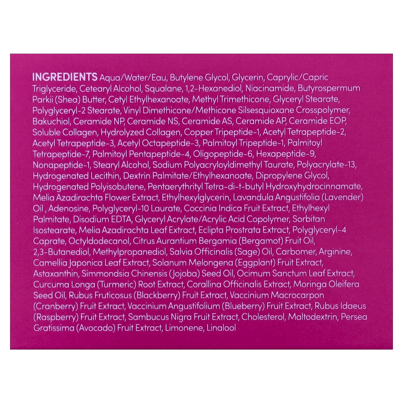 Вода (Aqua/eau), бутиленгликоль, глицерин, каприловый/каприновый триглицерид, цетеариловый спирт, сквалан, 1,2-гександиол, никотинамид, масло ши (Butyrospermum parkii), цетилэтилгексаноат, метилтриметикон, глицерил стеарат, полиглицерил-2 стеарат, винил диметикон/метикон силсесквиоксан кроссполимер, бакучиол, керамид NP, керамид NS, керамид AS, керамид АP, керамид EOP, растворимый коллаген, гидролизованный коллаген, меди трипептид-1, ацетил тетрапептид-2, ацетил тетрапептид-3, ацетил октапептид-3, пальмитоил трипептид-1, пальмитоил тетрапептид-7, пальмитоил пентапептид-4, олигопептид-6, гексапептид-9, нонапептид-1, стеариловый спирт, полиакрилодиметил таурат натрия, полиакрилат-13, гидрогенизированный лецитин, декстрин пальмитат/этилгексаноат, дипропиленгликоль, гидрогенизированный полиизобутен, пентаэритритил тетра-ди-трет-бутил гидроксигидроциннамат, экстракт цветков дерева ним (Melia azadirachta), этилгексилглицерин, лавандовое масло (Lavandula angustifolia), аденозин, полиглицерил-10 лаурат, экстракт плодов кокцинии индийской (Coccina indica), этилгексил пальмитат, двунатриевая ЭДТК, сополимер глицерил акрилата/акриловой кислоты, сорбитан изостеарат, экстракт листьев дерева ним (Melia azadirachta), экстракт эклипты простёртой (Eclipta prostrata), полиглицерил-4 капрат, октилдодеканол, масло бергамота (Citrus aurantium bergamia), 2,3-бутандиол, метилпропандиол, масло шалфея (Salvia officinalis), карбомер, аргинин, экстракт листьев камелии японской (Camellia japonica), экстракт плодов баклажана (Solanum melongena), астаксантин, масло из семян жожоба (Simmondsia chinensis), экстракт листьев туласи (Ocimum sanctum), экстракт корня куркумы (Curcuma longa), экстракт кораллины лекарственной (Corallina officinalis), масло из семян моринги масличной (Moringa oleifera), экстракт ягод ежевики (Rubus fructicosus), экстракт ягод клюквы (Vaccinium macrocarpon), экстракт ягод голубики (Vaccinium angustifolium), экстракт ягод малины (Rubus idaeus), экстракт плодов черной бузины (Sambucus nigra), холестерина, мальтодекстрин, экстракт плодов авокадо (Persea gratissima), лимонен, линалоол.