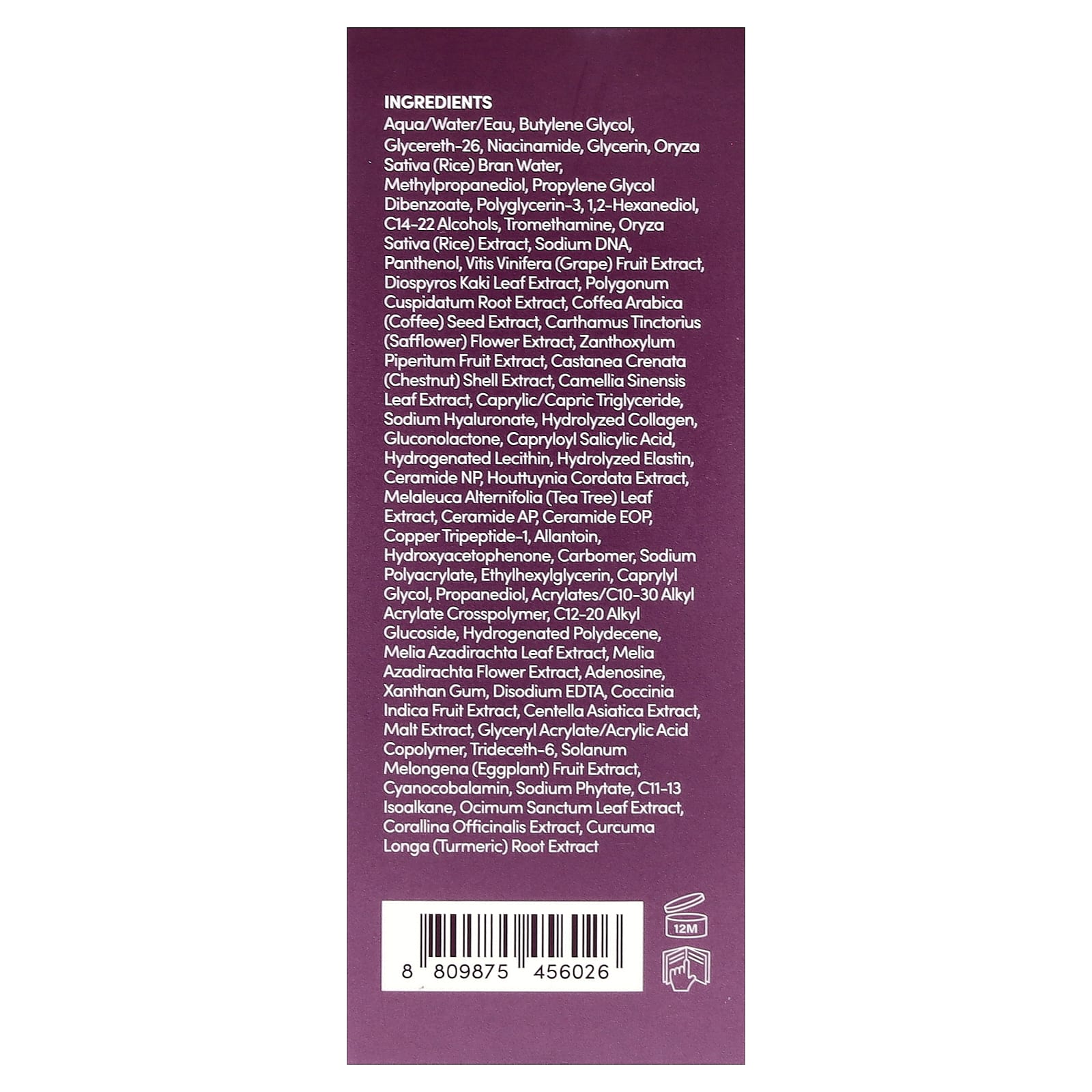 Вода, бутиленгликоль, глицерет-26, никотинамид, глицерин, вода из рисовых отрубей (Oryza sativa), метилпропандиол, пропиленгликоль дибензоат, полиглицерин-3,1,2-гександиол, c14-22 спирты, трометамин, экстракт риса (Oryza sativa), ДНК натрия, пантенол, экстракт плодов винограда (Vitis vinifera), экстракт листьев хурмы восточной (Diospyros kaki), экстракт корня рейнутрии японской (Polygonum cuspidatum), экстракт зерен кофе арабики (Coffea arabica), экстракт цветков сафлора (Carthamus tinctorius), экстракт сычуаньского перца (Zanthoxylum piperitum), экстракт скорлупы каштана (castanea crenata), экстракт листьев зелёного чая (Camellia sinensis), каприловый/каприновый триглицерид, гиалуронат натрия, гидролизованный коллаген, глюконолактон, каприлоил салициловой кислоты, гидрогенизированный лецитин, гидролизованный эластин, керамид NP, экстракт хауттюйнии (Houttuynia cordata), экстракт листьев чайного дерева (Melaleuca alternifolia), керамид АP, керамид EOP, меди трипептид-1, аллантоин, гидроксиацетофенон, карбомер, полиакрилат натрия, этилгексилглицерин, каприлилгликоль, пропандиол, акрилат/c10-30 алкил акрилат кроссполимер, c12-20 алкил глюкозид, гидрогенизированный полидецен, экстракт листьев дерева ним (Melia azadirachta), экстракт цветков дерева ним (Melia azadirachta), аденозин, ксантановая камедь, двунатриевая ЭДТК, экстракт плодов кокцинии индийской (Coccina indica), экстракт готу колы (Centella asiatica), экстракт солода, сополимер глицерил акрилата/акриловой кислоты, тридецет-6, экстракт плодов баклажана (Solanum melongena), цианокобаламин, фитат натрия, c11-13 изоалкан, экстракт листьев туласи (Ocimum sanctum), экстракт кораллины лекарственной (Corallina officinalis), экстракт корня куркумы (Curcuma longa).