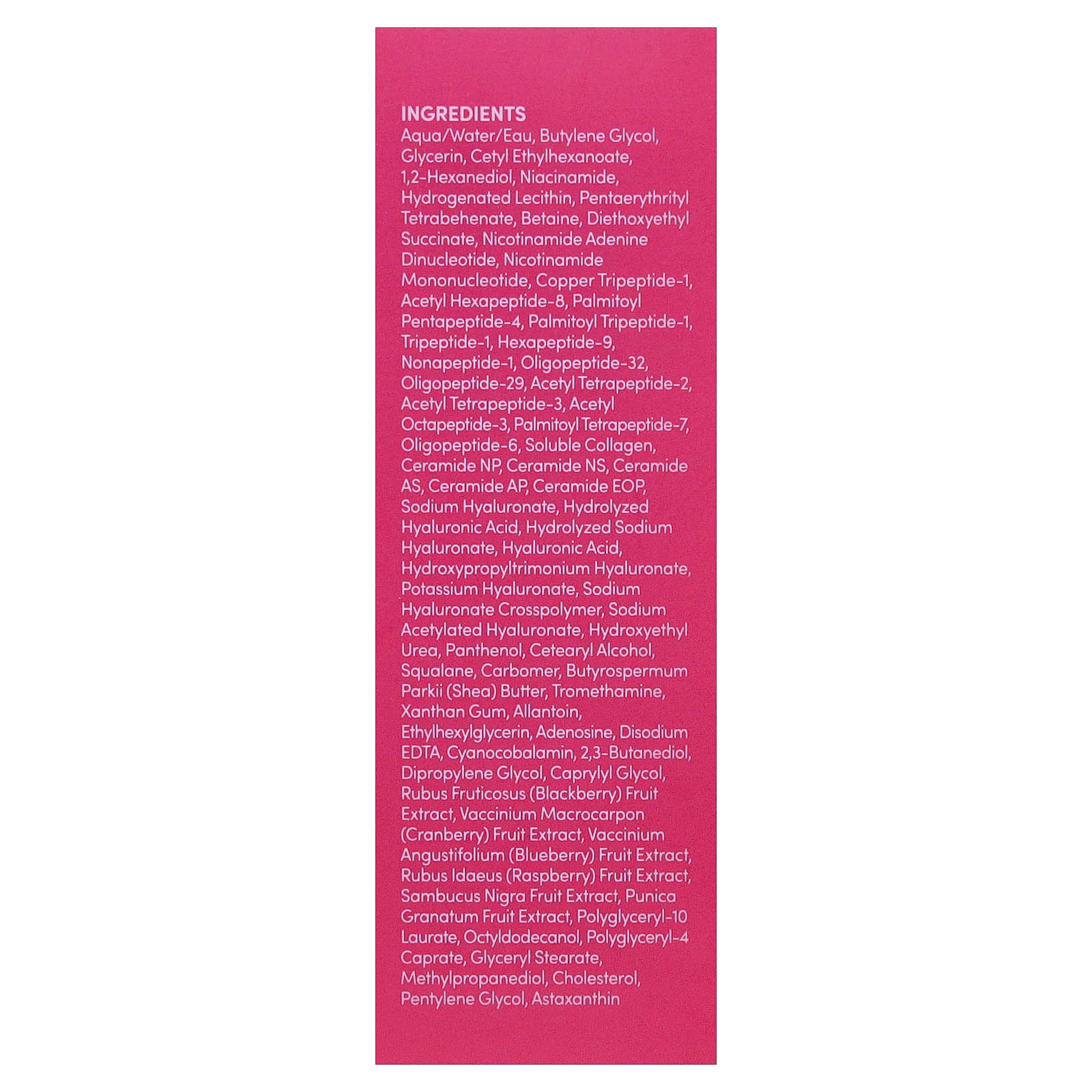 Вода, бутиленгликоль, глицерин, цетилэтилгексаноат, 1,2-гександиол, никотинамид, гидрогенизированный лецитин, пентаэритритил тетрабегенат, бетаин, диэтоксиэтил сукцинат, никотинамид аденин динуклеотид, никотинамид мононуклеотид, меди трипептид-1, ацетил гексапептид-8, пальмитоил пентапептид-4, пальмитоил трипептид-1, трипептид-1, гексапептид-9, нонапептид-1, олигопептид-32, олигопептид-29, ацетил тетрапептид-2, ацетил тетрапептид-3, ацетил октапептид-3, пальмитоил тетрапептид-7, олигопептид-6, растворимый коллаген, керамид NP, керамид NS, керамид AS, керамид АP, керамид EOP, гиалуронат натрия, гидролизованная гиалуроновая кислота, гидролизованный гиалуронат натрия, гиалуроновая кислота, гиалуронат гидроксипропилтримония, гиалуронат калия, кроссполимер гиалуроната натрия, ацетилированный гиалуронат натрия, гидроксиэтилированная мочевина, пантенол, цетеариловый спирт, сквалан, карбомер, масло ши (Butyrospermum parkii), трометамин, ксантановая камедь, аллантоин, этилгексилглицерин, аденозин, двунатриевая ЭДТК, цианокобаламин, 2,3-бутандиол, дипропиленгликоль, каприлилгликоль, экстракт ягод ежевики (Rubus fructicosus), экстракт ягод клюквы (Vaccinium macrocarpon), экстракт ягод голубики (Vaccinium angustifolium), экстракт ягод малины (Rubus idaeus), экстракт плодов черной бузины (Sambucus nigra), экстракт плодов граната (Punica granatum), полиглицерил-10 лаурат, октилдодеканол, полиглицерил-4 капрат, глицерил стеарат, метилпропандиол, холестерина, пентилен гликоль, астаксантин.